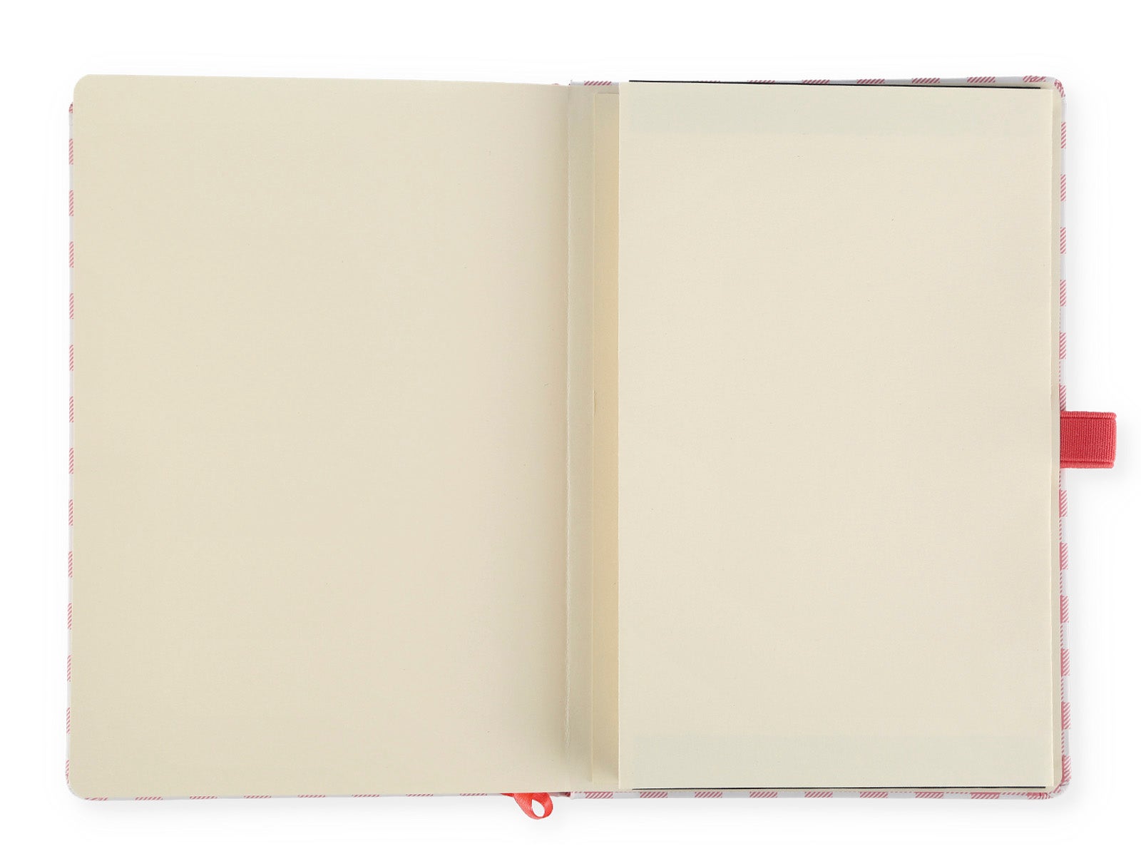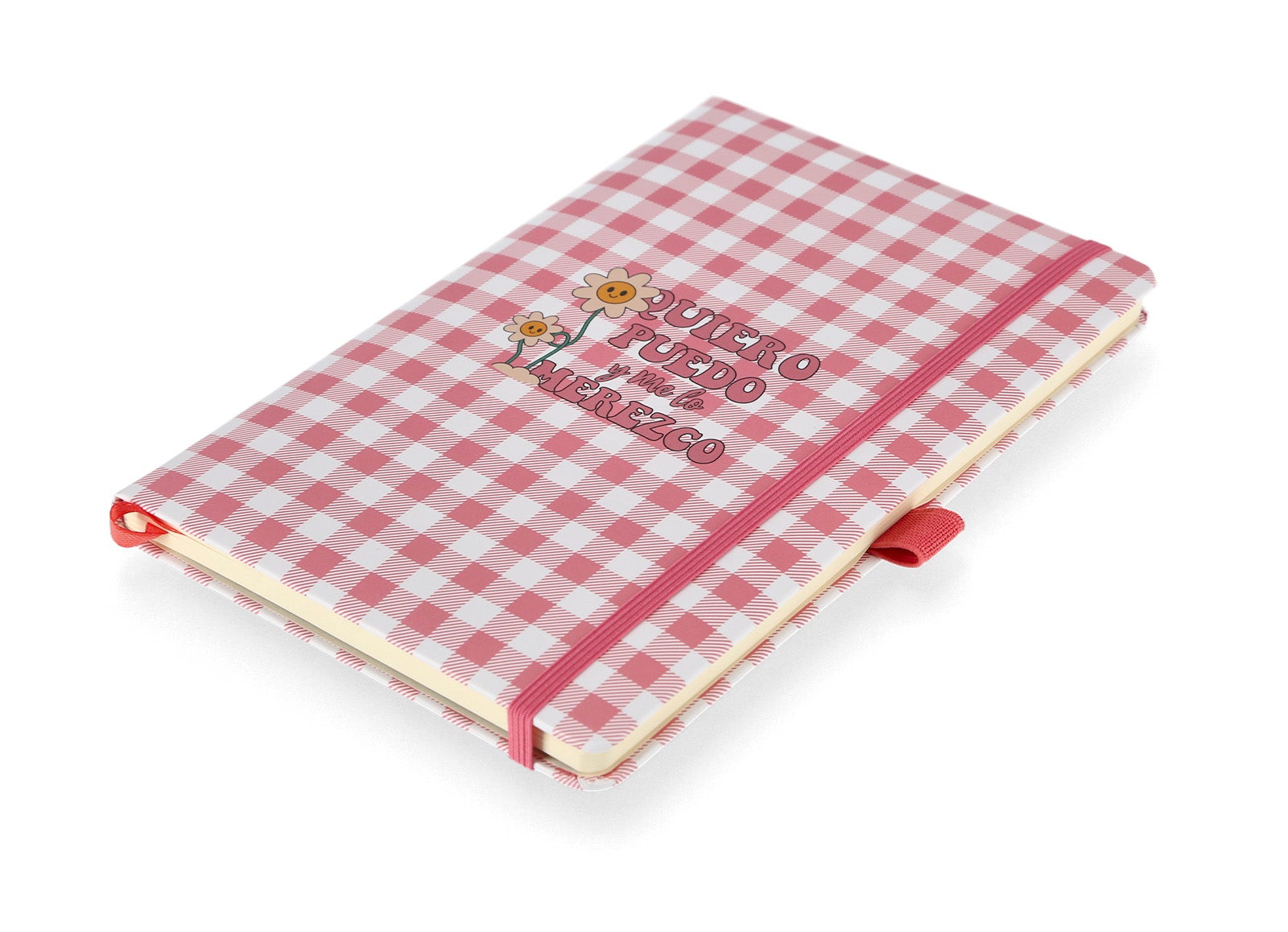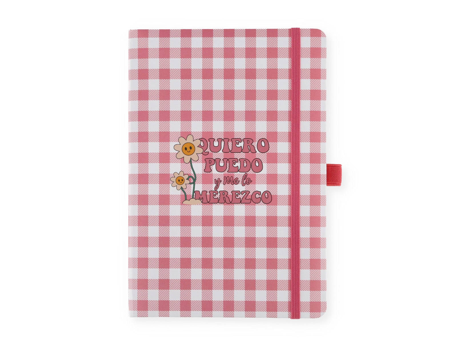 Diseño: libreta sin anillas con banda elástica en el lateral para poder cerrarla y que no se te escape nada y goma para colocar tu boli favorito.