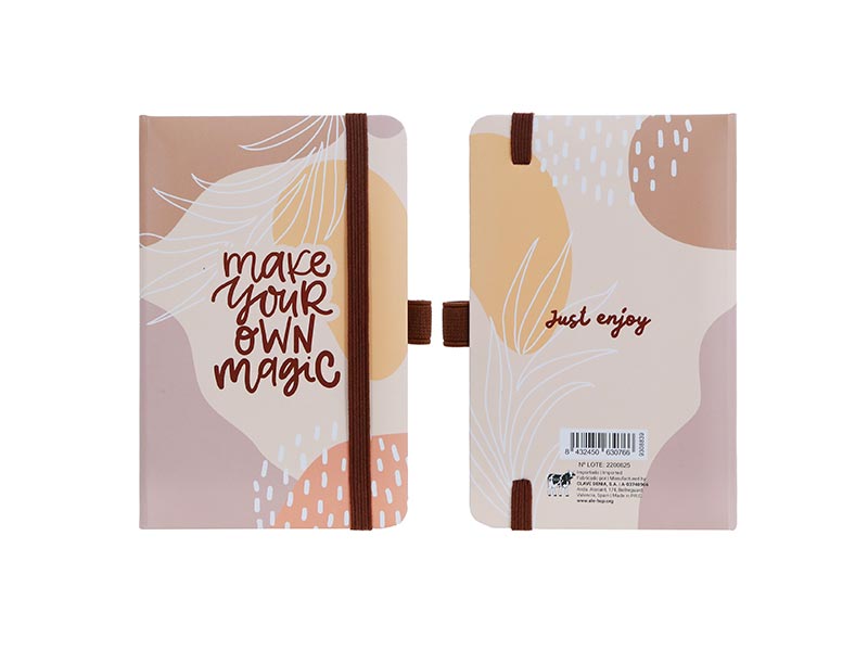 Diseño: libreta en tonos beige y marrones con estampado de hojas y círculos, texto central en la portada súper motivador ‘make your own magic’ y en la contraportada ‘just enjoy’. Queremos recordarte que la vida está para disfrutarla y tú mismo puedes hacer magia con ella... ¡solo disfruta al máximo!