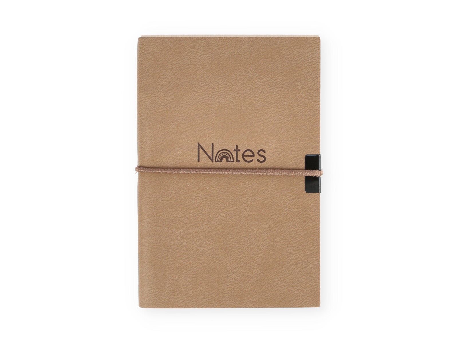 - Su cubierta es de un agradable tono marrón, con una sensación suave y texturizada que transmite un aire de alta calidad. El cierre elástico complementa el diseño con un toque sutil y funcional.