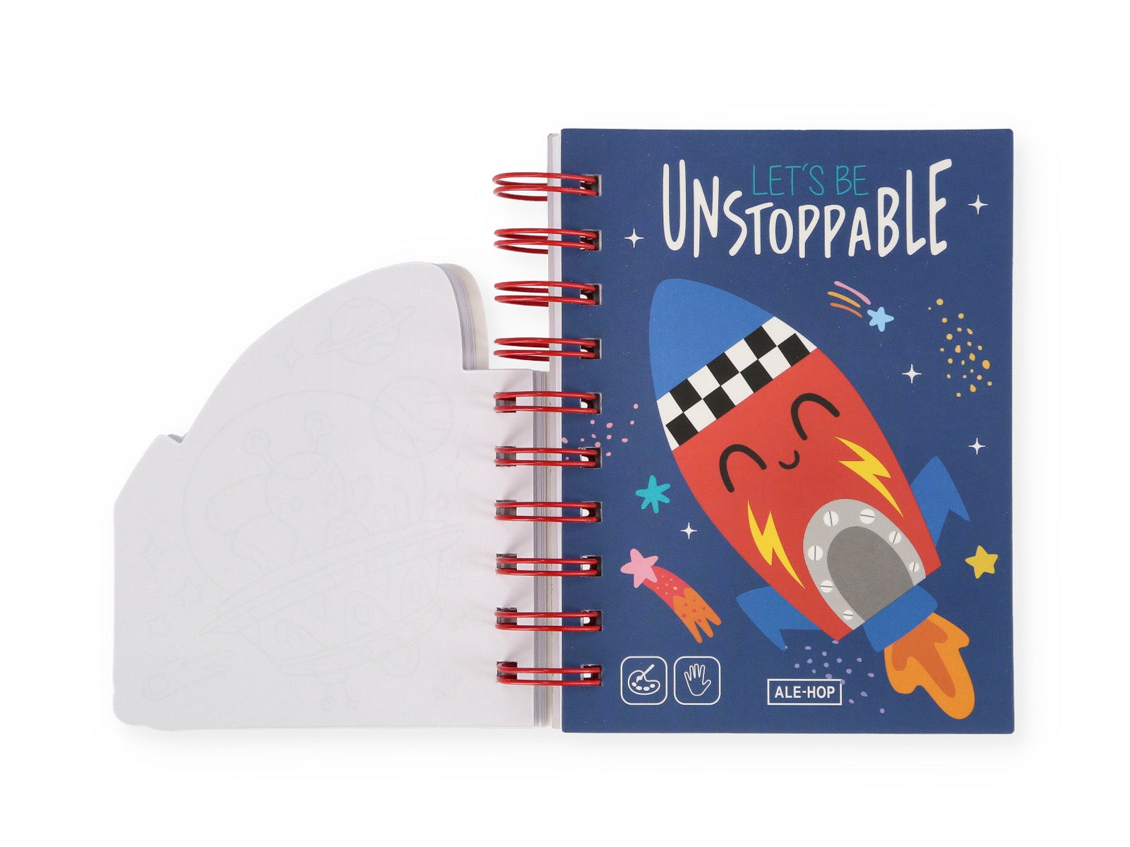 No hay límites en lo que puedes crear con la libreta de anillas cohete para pintar de ALE-HOP. ¡Apunta alto y deja tu huella en el espacio!