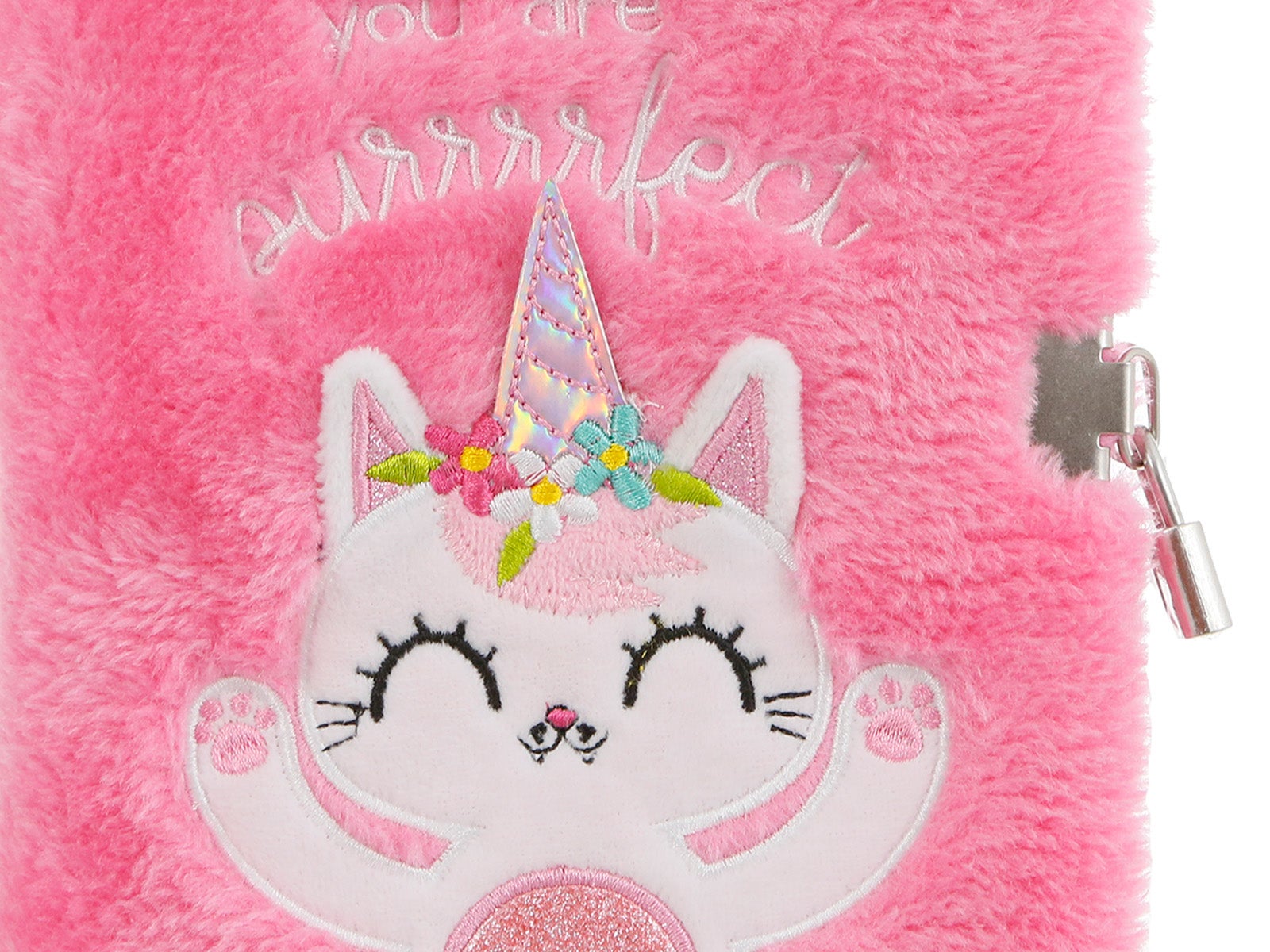 - Diseño: Libreta peluda de color fucsia con la figura de un gaticornio en la portada.