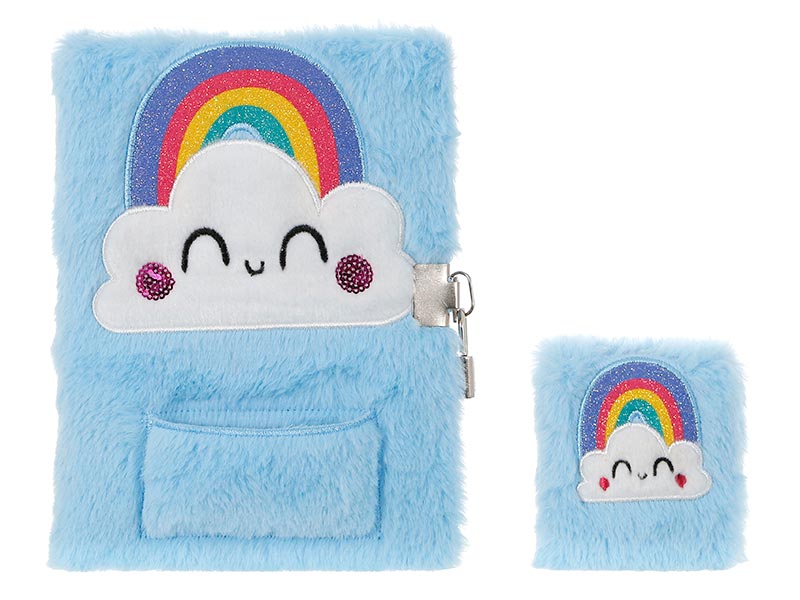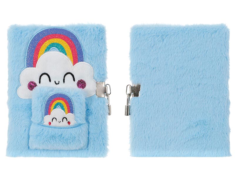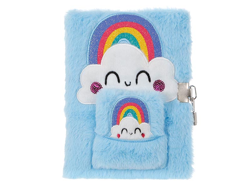 Diseño: exterior de pelito azul con forma de nube y arcoíris y un bolsillo exterior que guarda una libreta más pequeña para tus notas.