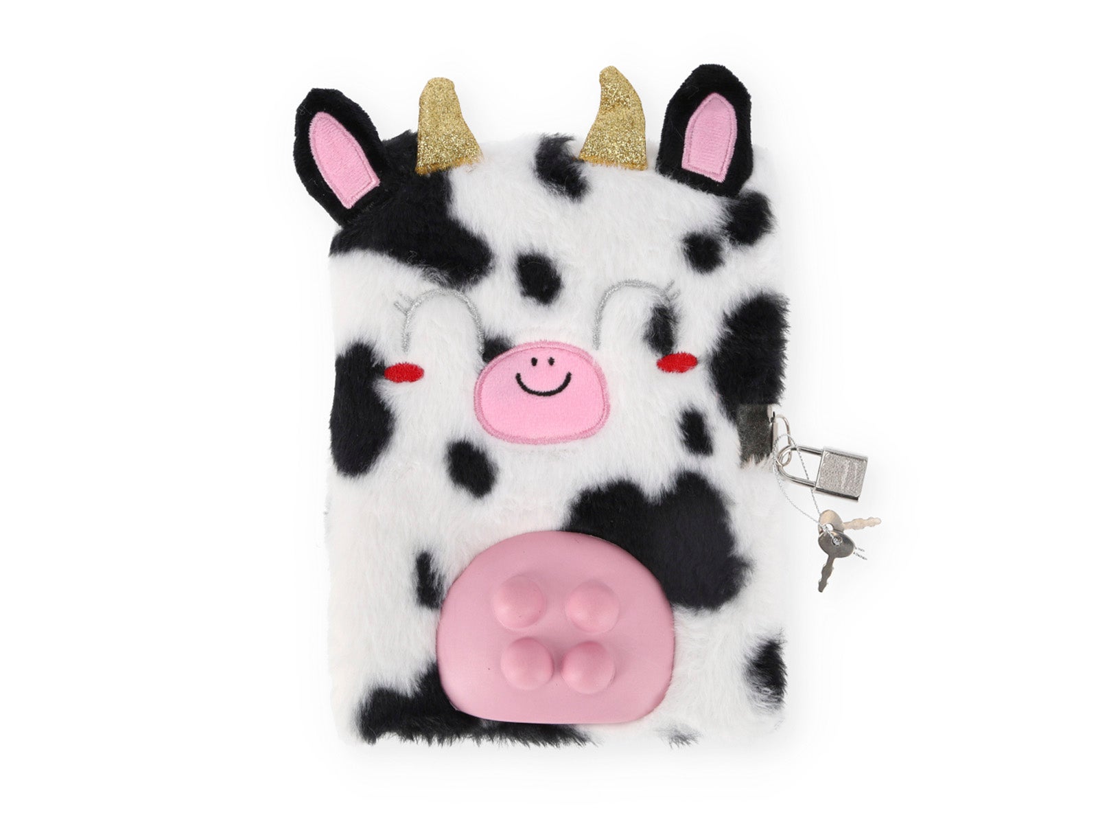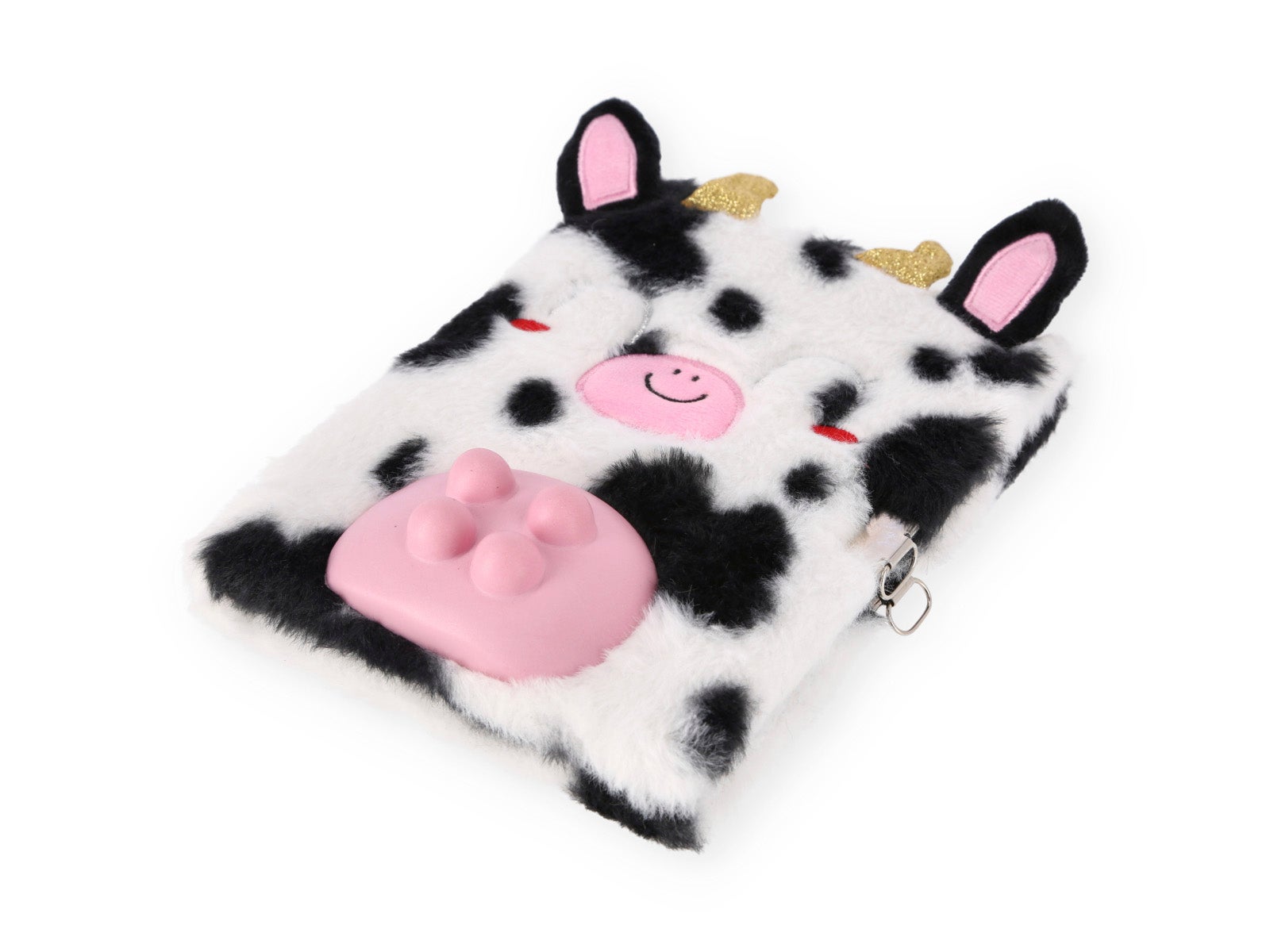 - Diseño: Libreta peluda con la imagen de una adorable vaca y candado incorporado.