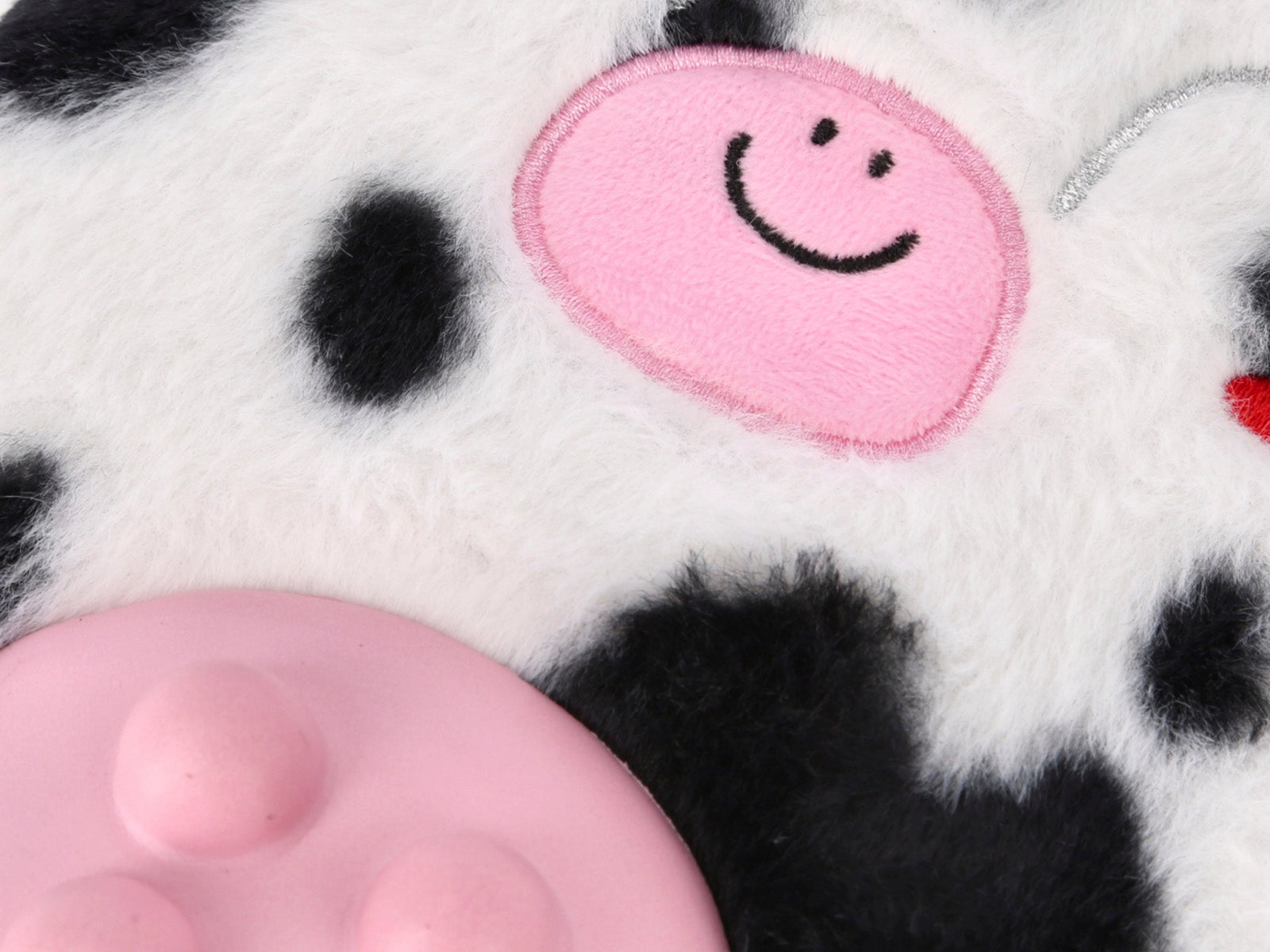 - Exterior: Cubierta de felpa suave al tacto con detalles de vaca en blanco y negro.