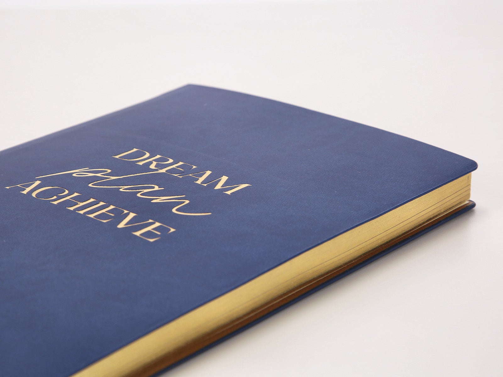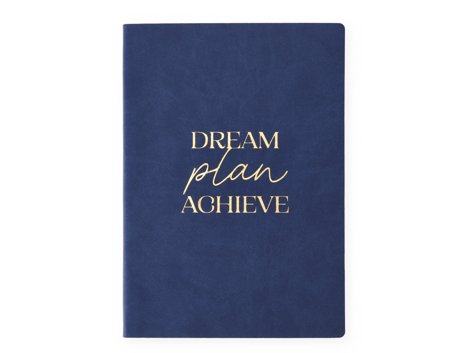 Organiza tus sueños y metas con la Libreta elegante azul - Dream plan achieve. Ideal para aquellos que quieren llevar un registro de sus aventuras y pensamientos. Deja que tus ideas brillen en una cubierta que te inspira a soñar en grande cada día. ¡Una inyección de motivación al alcance de tu mano!