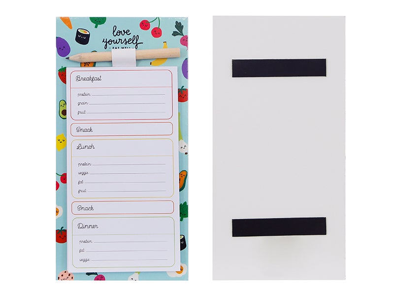 Diseño: esta libreta consiste en un imán para nevera en el que podrás escribir tus comidas en tres líneas en las que deberás marcar el producto que comes de lo que se te propone. En la parte superior dispones de un lápiz para escribir y dejarlo guardado. ¡No lo saques del cajón cada vez! La base es de color azul con estampado de frutas y verduras. Y arriba puedes leer su frase: ‘love yourself, eat well'.