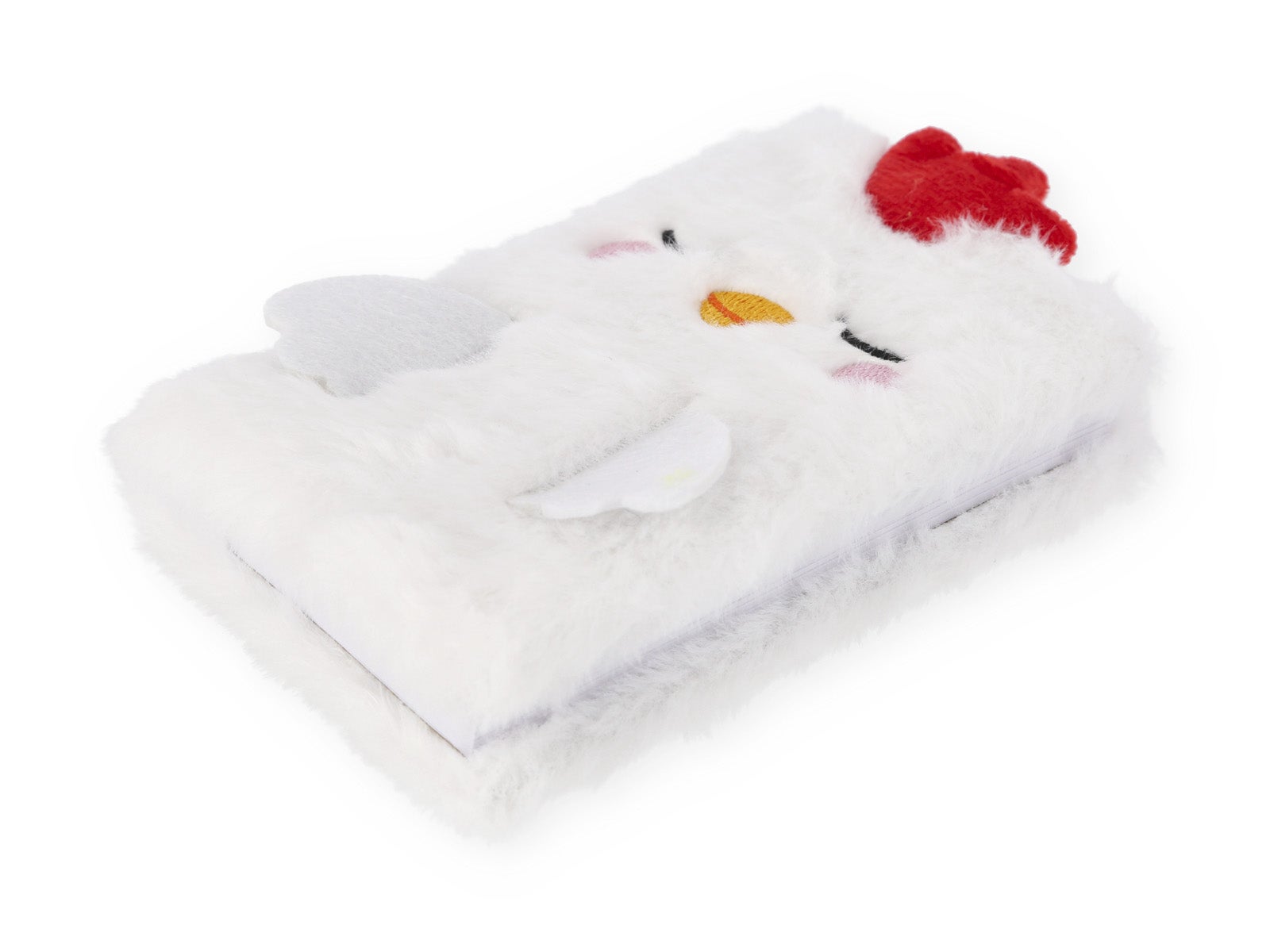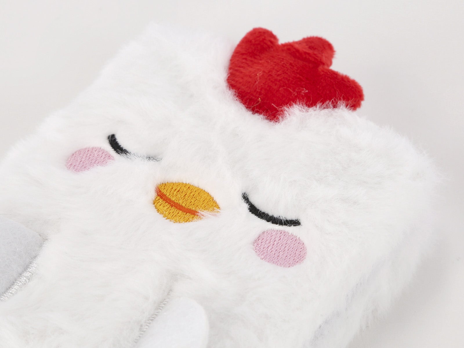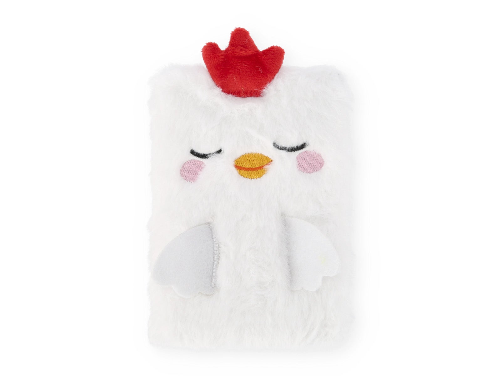 - Diseño: La cubierta blanca y peluda simula el plumaje de un pollito soñoliento, con una cresta roja, mejillas rosadas y un simpático pico naranja.