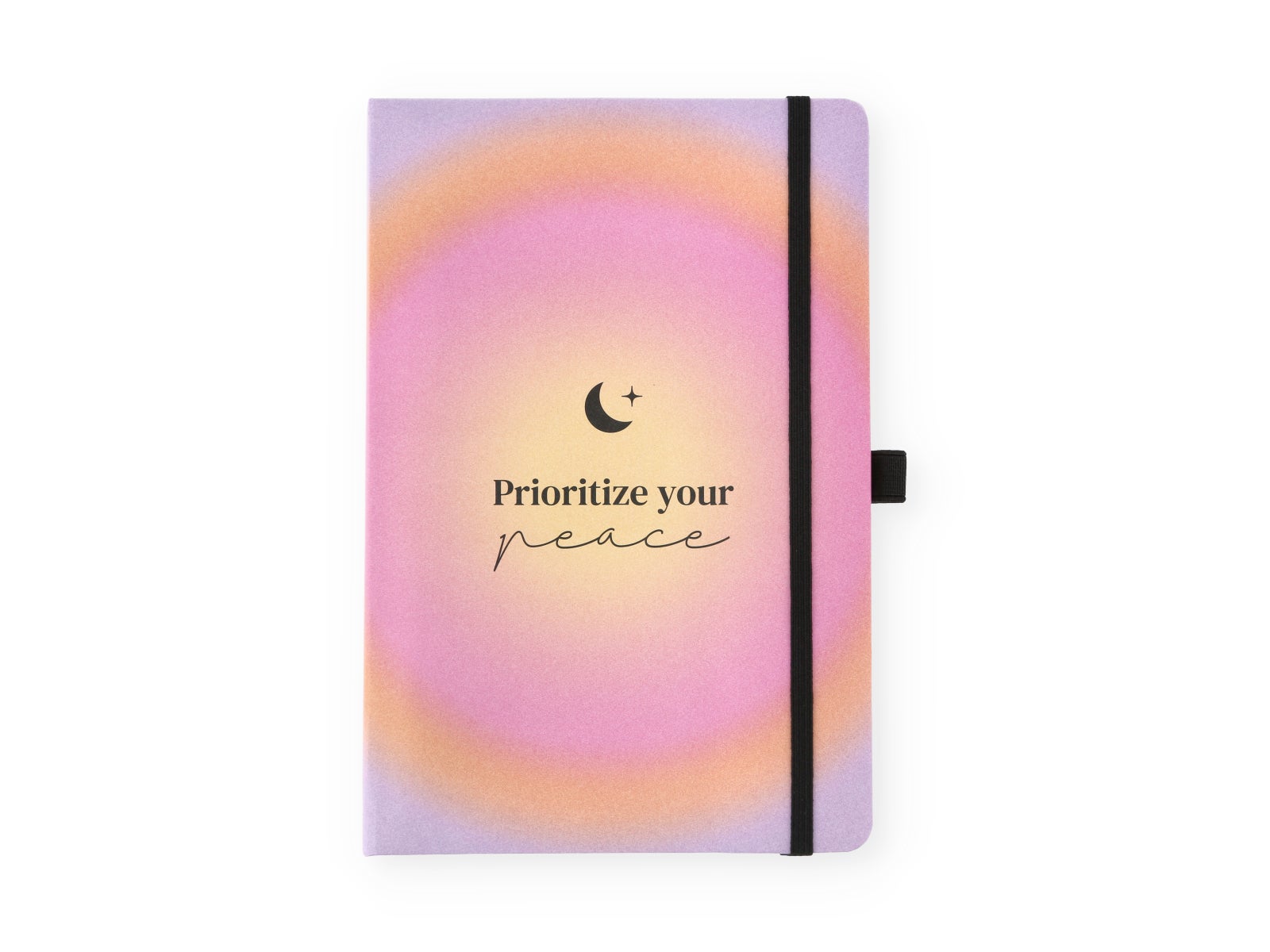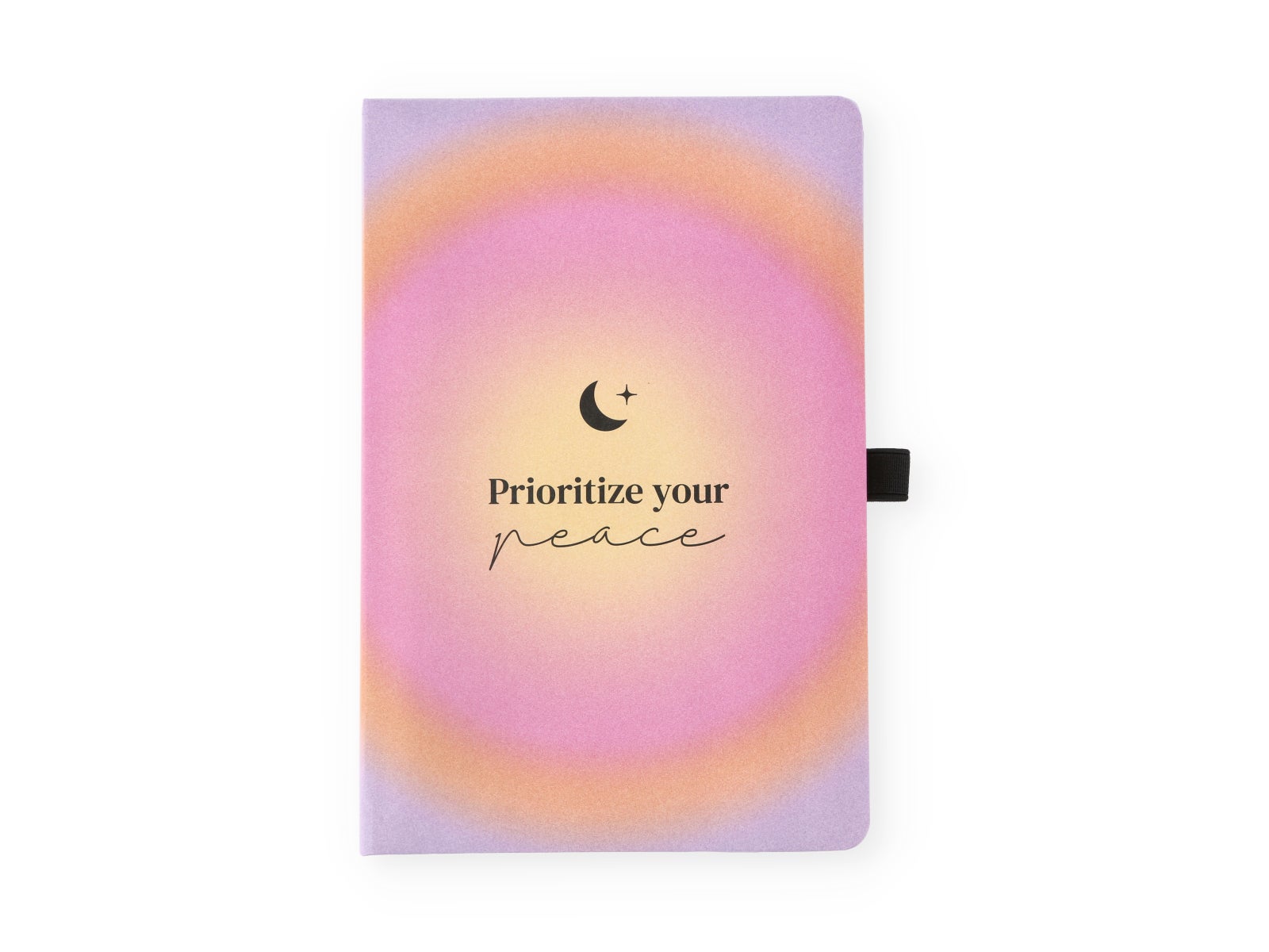 - Portada: estampado relajante en tonos suaves y calmantes. Frase inspiradora "Prioritize your peace" para recordarte lo importante que es tu bienestar.
