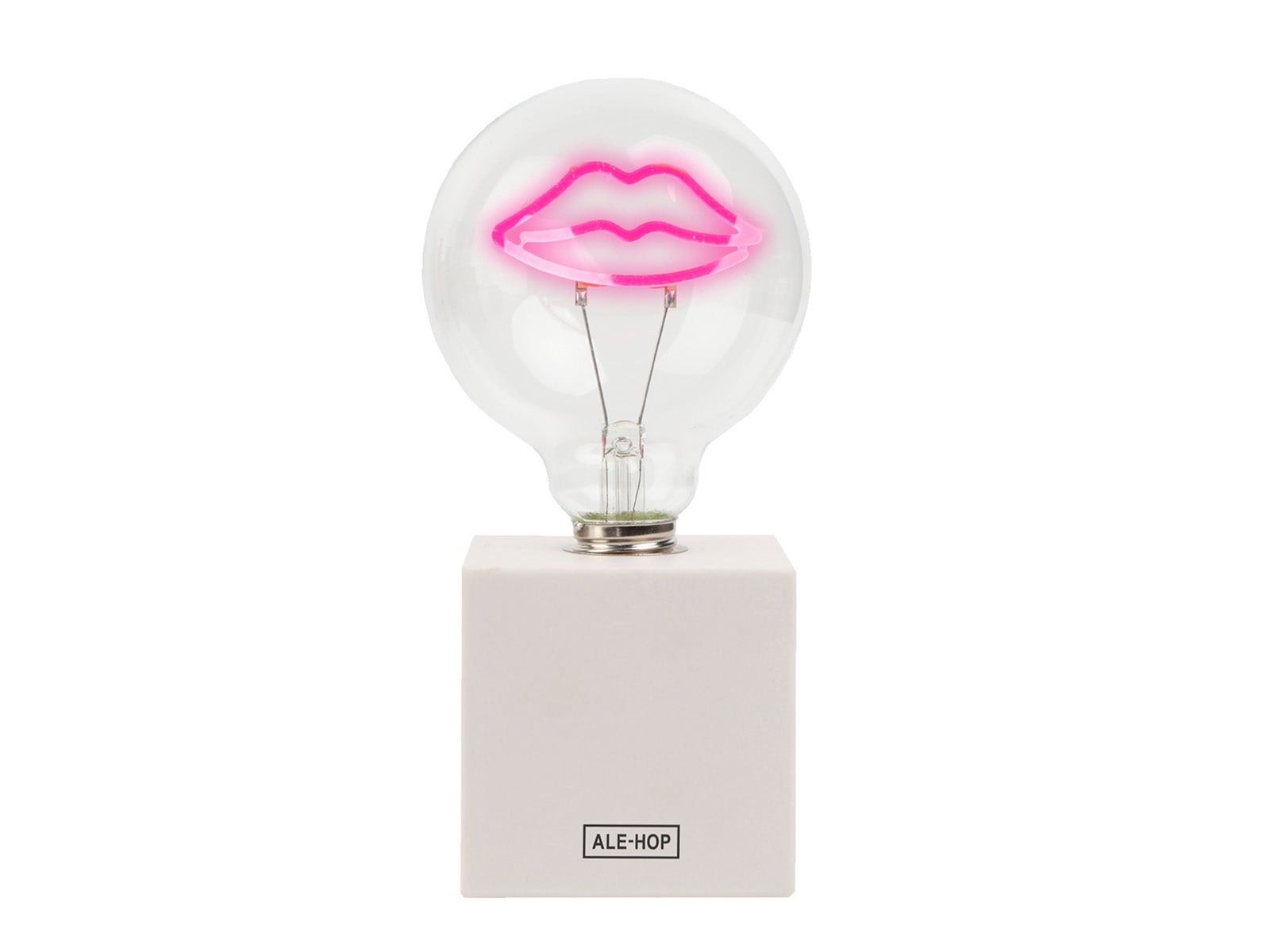 Este elemento esencial para cualquier amante de la decoración se apoya en una base rectangular blanca y asciende por una estructura delgada metálica que sostiene una ampolla transparente. Dentro de esta ampolla, encontrarás una sorpresa brillante: unos labios de color fucsia que no pasarán desapercibidos.