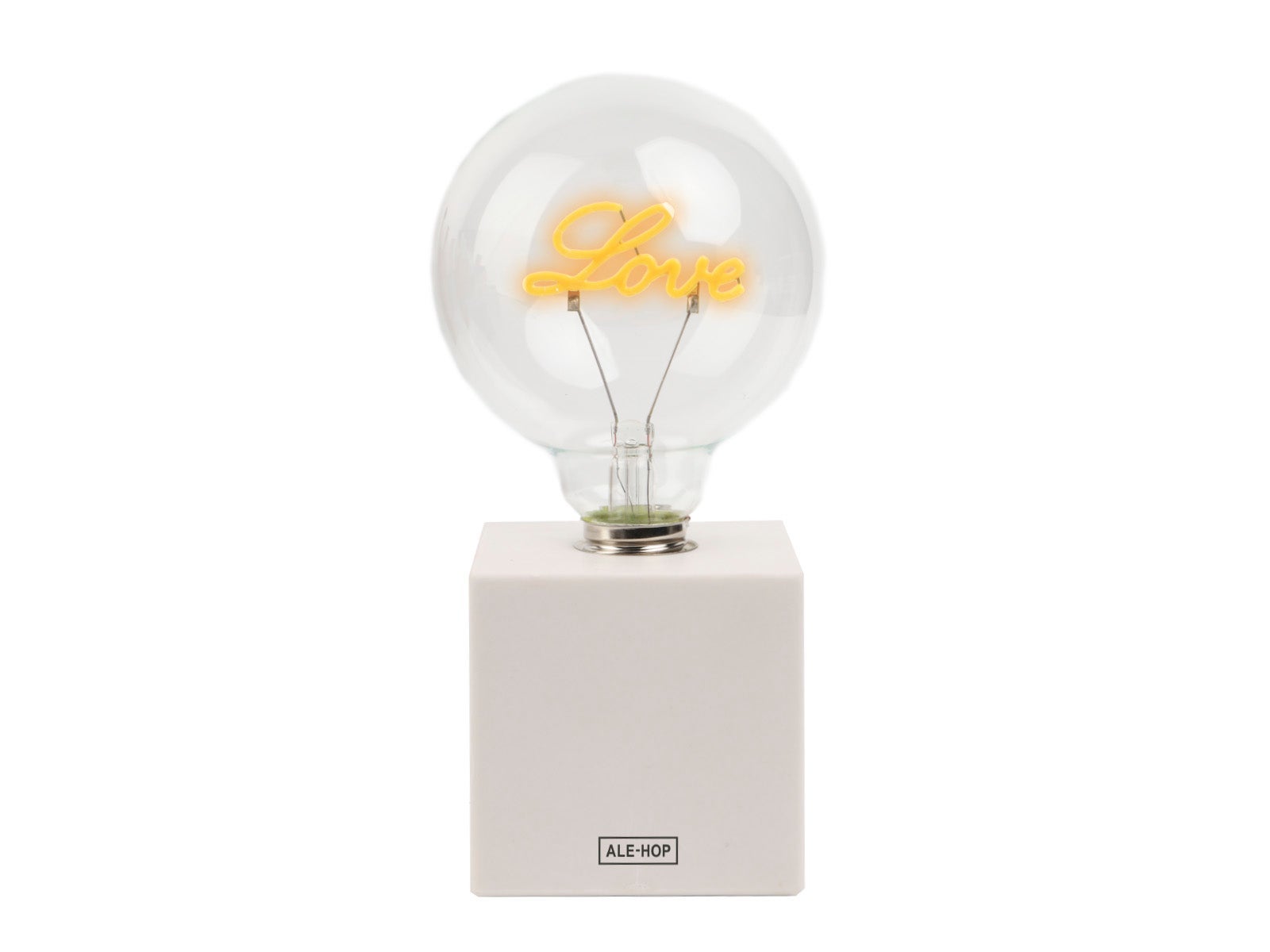 - Diseño: Entra en modo 'Amor' con esta elegante luz decorativa. Presenta una base cúbica blanca con nuestro logotipo ALE-HOP y sobre ella se alza una esfera de vidrio transparente que alberga el mensaje 'Love' en un color dorado. Un diseño sencillo pero emblemático, capaz de sacar una sonrisa a cualquier persona enamorada.