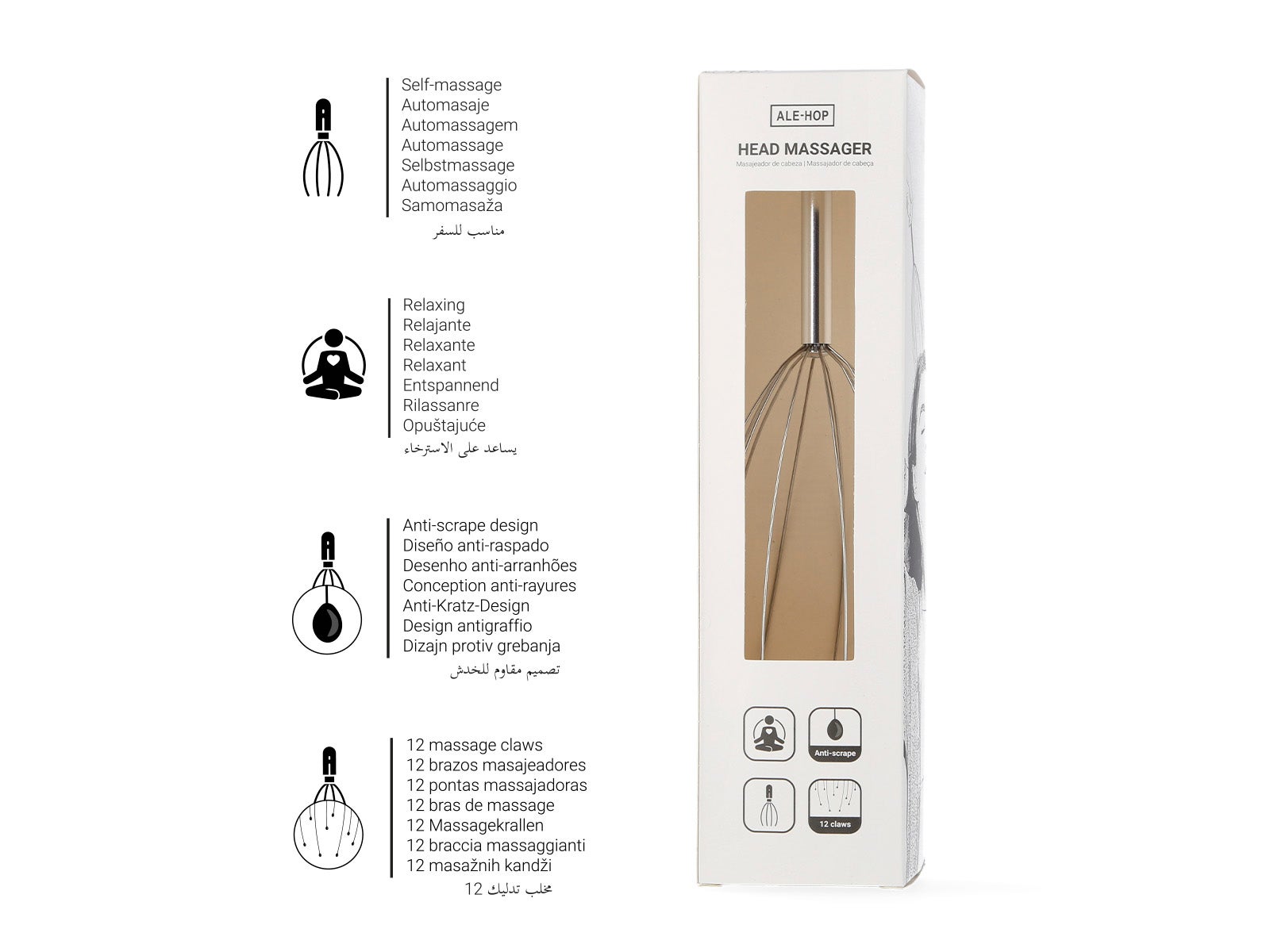 - Automasaje y Relajación: ¿Qué podría ser más relajante que un masaje de cabeza después de un largo día? Con el masajeador de cabeza gris de ALE-HOP, puedes disfrutar de un automasaje cada vez que lo necesites. No te dará ningún rasguño, sino una sensación de pura bienaventuranza.