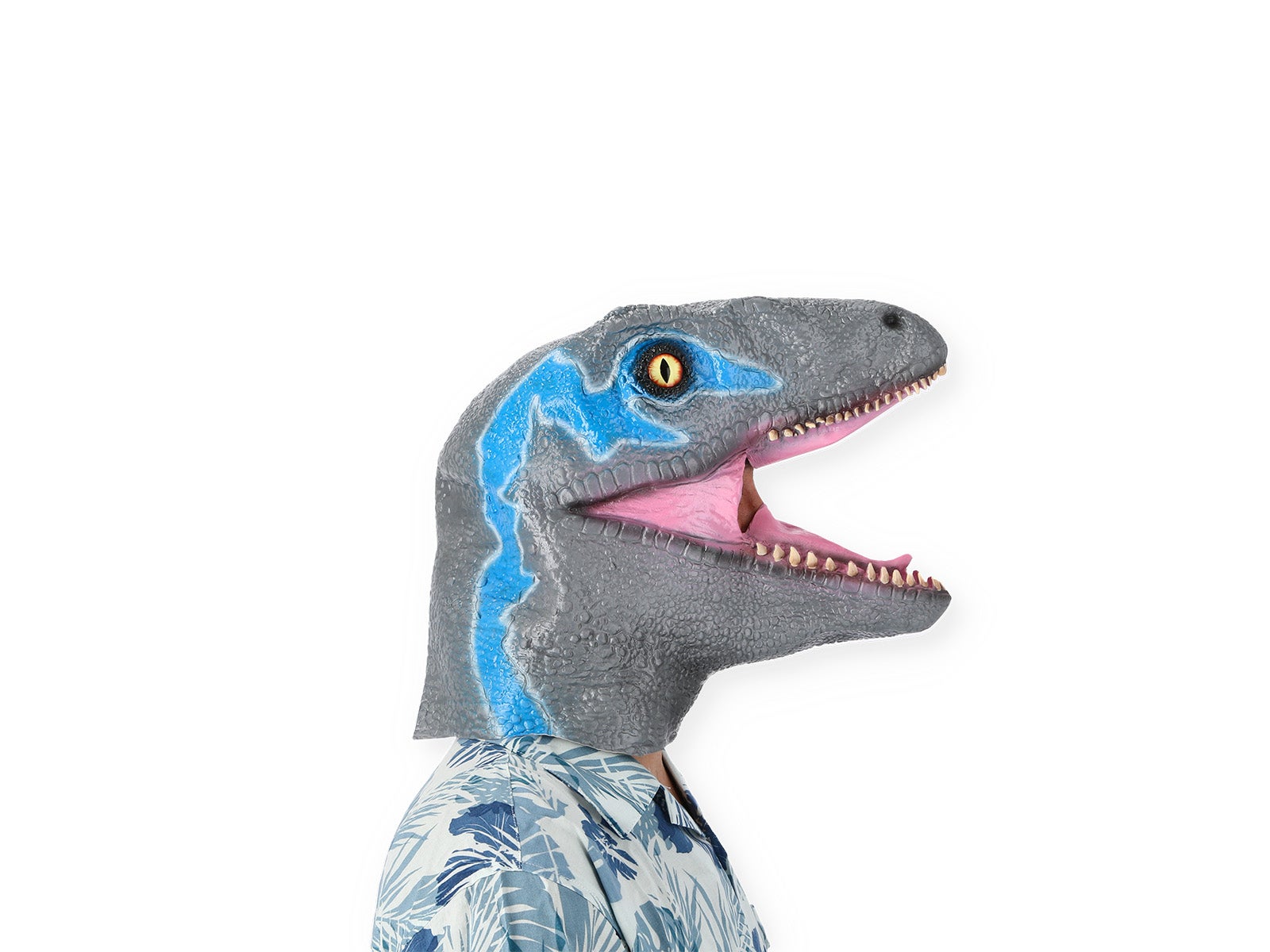 Máscara de velociraptor realista ALE-HOP: con ojos impactantes y boca con dientes, colores gris y azul, perfecta para fiestas y crear recuerdos únicos.
