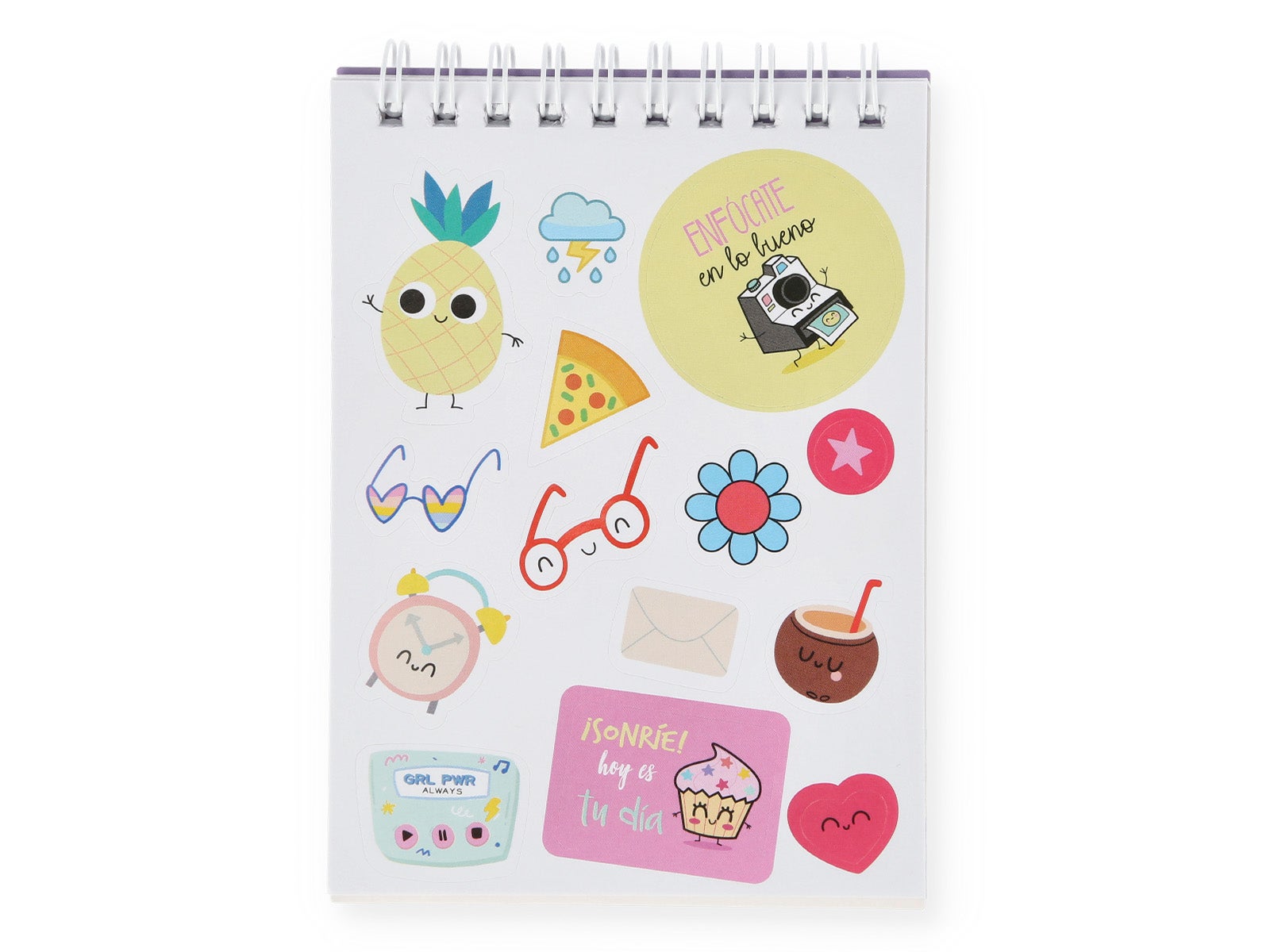 Cada página de la libreta está diseñada para hacer que tus apuntes sean divertidos y alegres. Sus pegatinas van desde ilustraciones de nubes lluviosas, piñas con pies y ojos, hasta mensajes motivadores como "GRL PWR ALWAYS" y "¡SONRÍE! hoy es tu día".