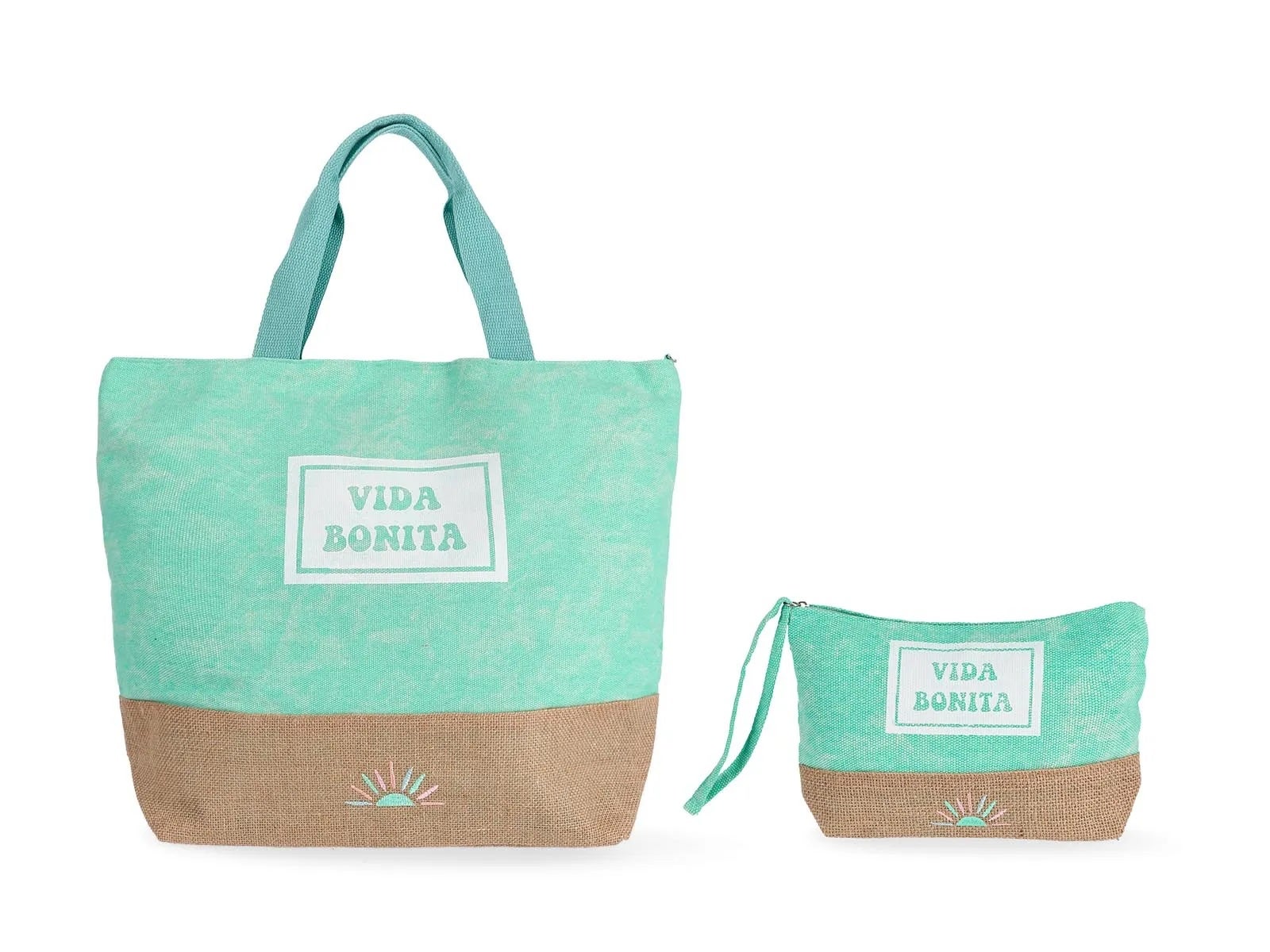 Pack bolso y neceser Vida bonita. Estampado animado y colores vibrantes. El bolso tiene frases motivadoras y suficiente espacio para tus esenciales. El neceser mantiene tus cosméticos organizados. Asas cómodas y cremallera práctica.