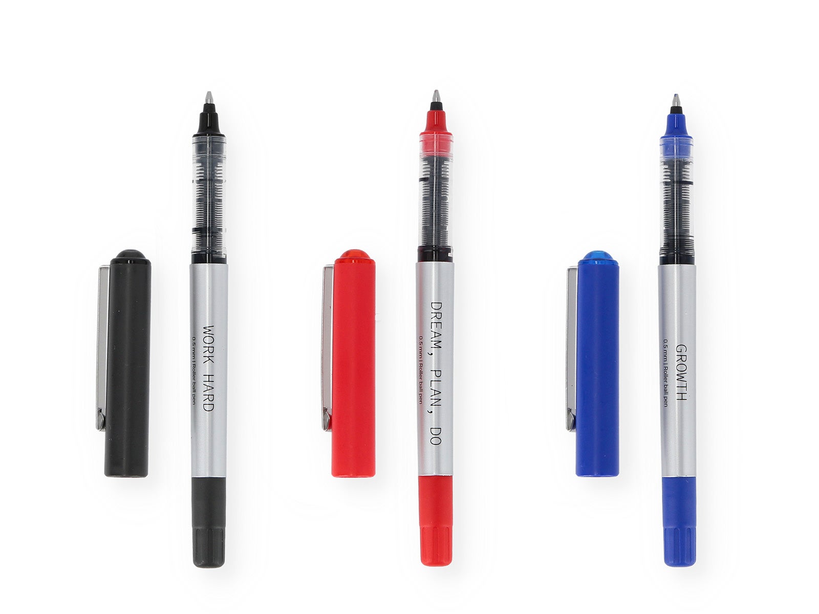 - Diseño: Bolis de color blanco con el nombre correspondiente a lo que cada color representa. ¡Anímate y "Work Hard" con el negro, "Dream, plan, do" con el rojo, y sigue en "Growth" con el azul!