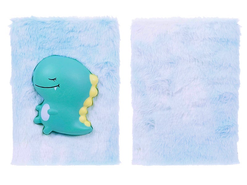 - Diseño: Libreta con cubierta de peluche de dinosaurio y bolígrafo a juego.