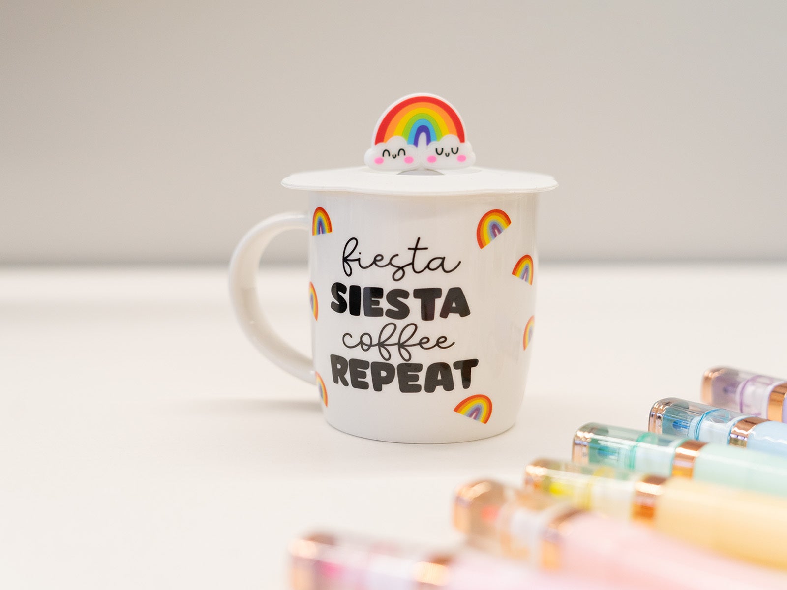 Empieza el día con energía. Pack taza y tapa - Fiesta, siesta, coffee, repeat. Disfruta del café caliente por más tiempo y con estilo. Un must para coffee lovers. ¡Añádelo a tu colección!