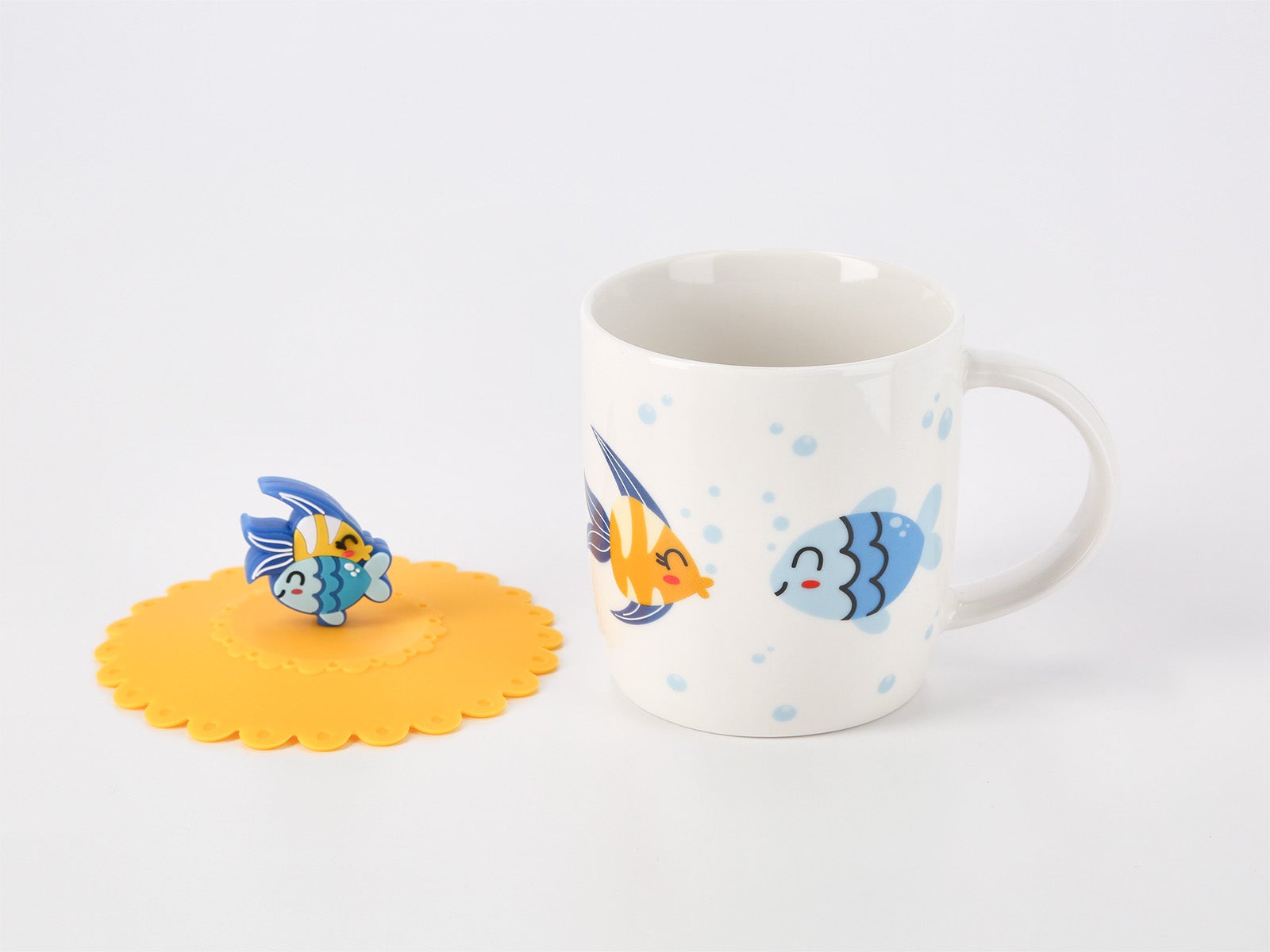 Diseño: Taza redonda con asa, de color blanco con un divertido dibujo de pez y un mensaje amoroso. La tapa con la forma de pez añade un toque especial.