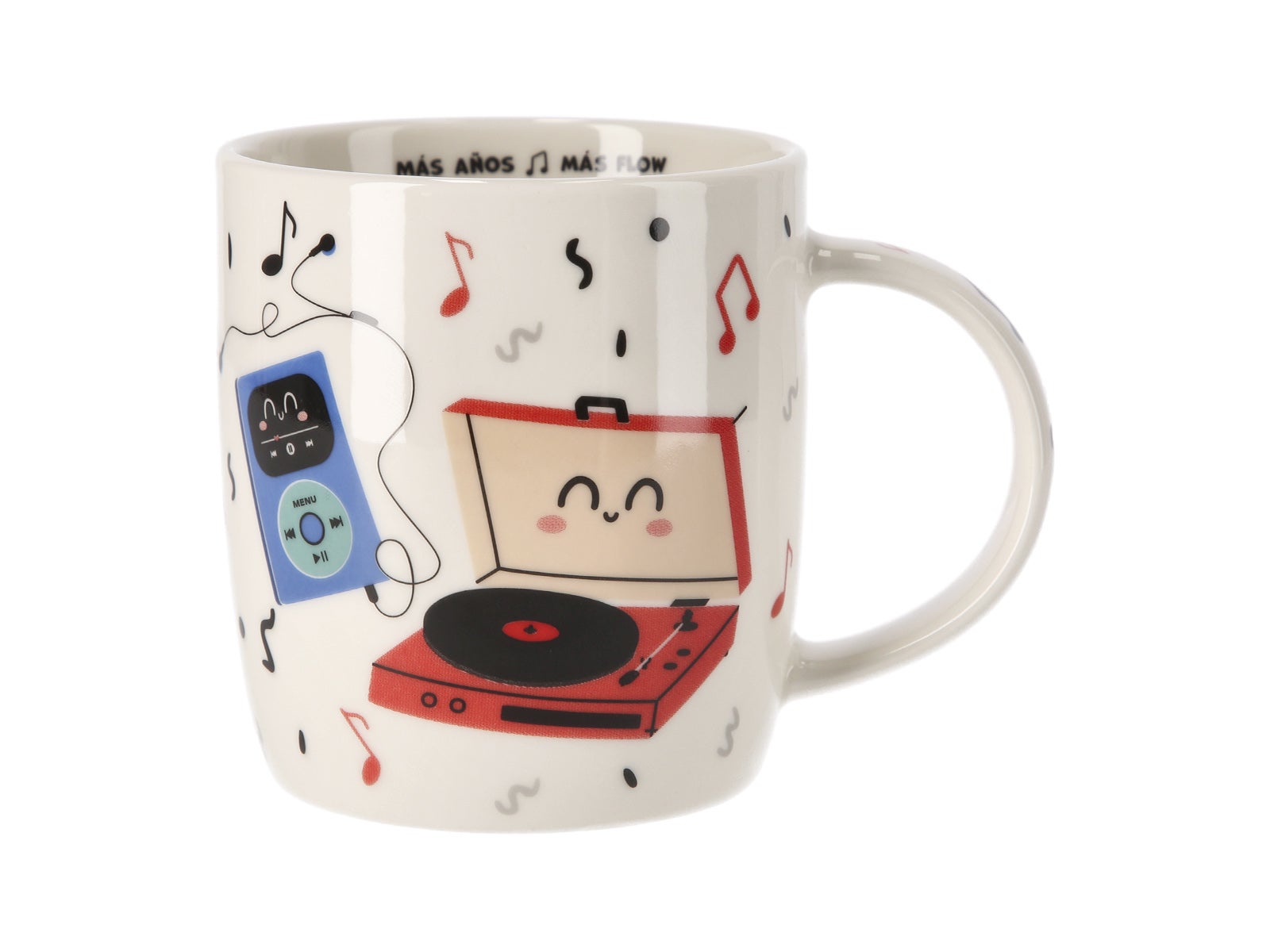 - Diseño retro musical: tapa con forma de tocadiscos y taza con mensaje divertido que rinde homenaje a los clásicos de siempre.