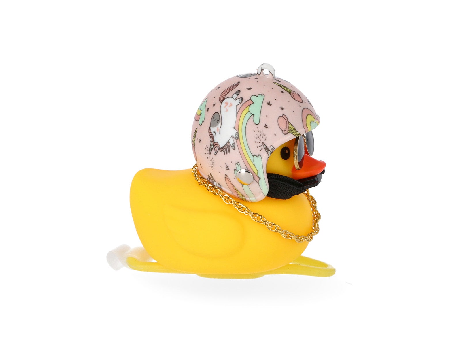 - Diseño encantador: patito de goma en un vibrante color amarillo con un casco lleno de unicornios.
