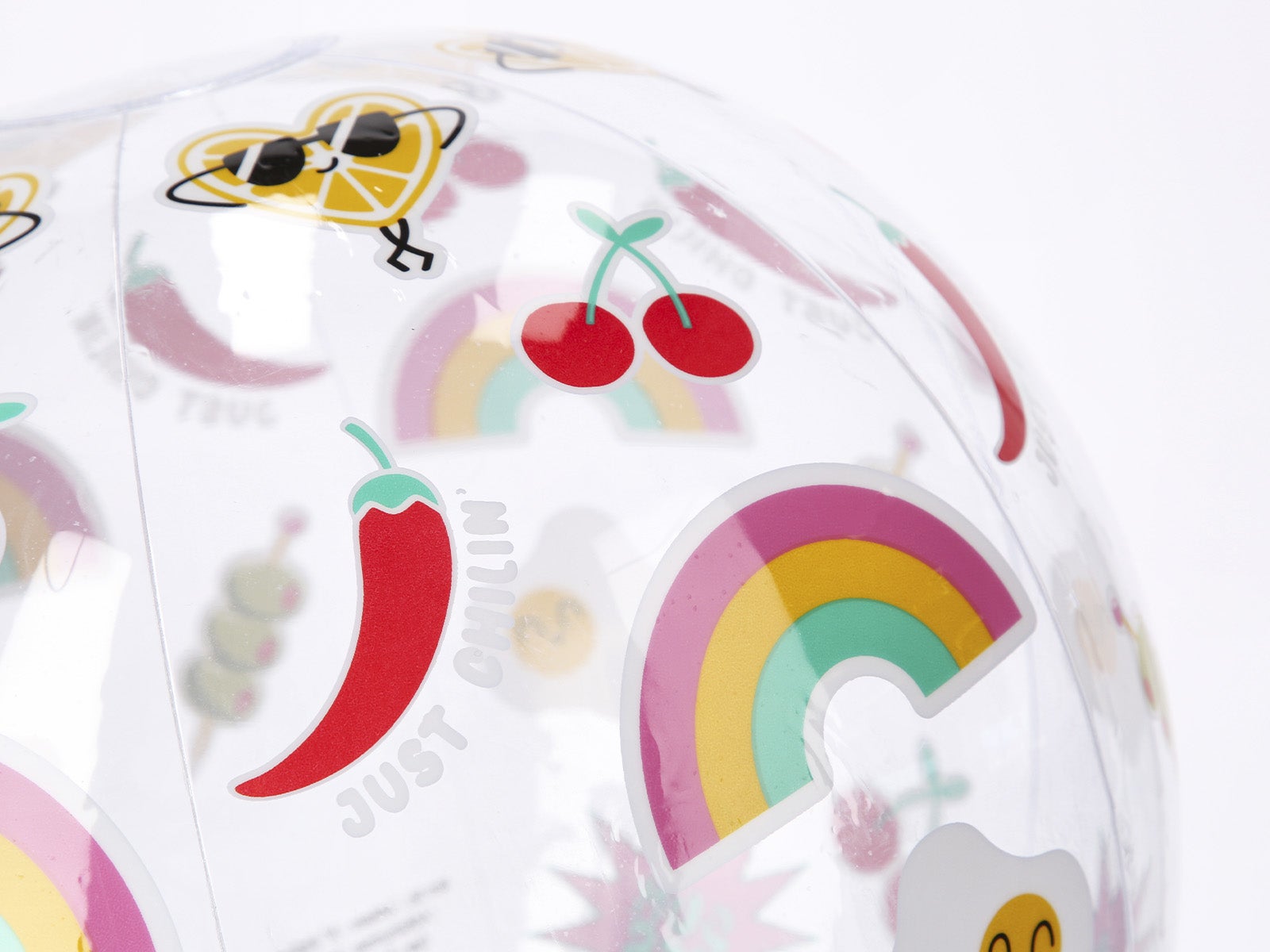 Haz que tus días de verano sean inolvidables con la Pelota hinchable - Just chilin' de ALE-HOP. Este balón de playa destaca por su diseño transparente repleto de iconos divertidos y coloridos que transmiten puro buen rollo. Es ligera, fácil de hinchar y perfecta para llevar a la playa, a la piscina o incluso al jardín. ¡Diversión asegurada para todas las edades!