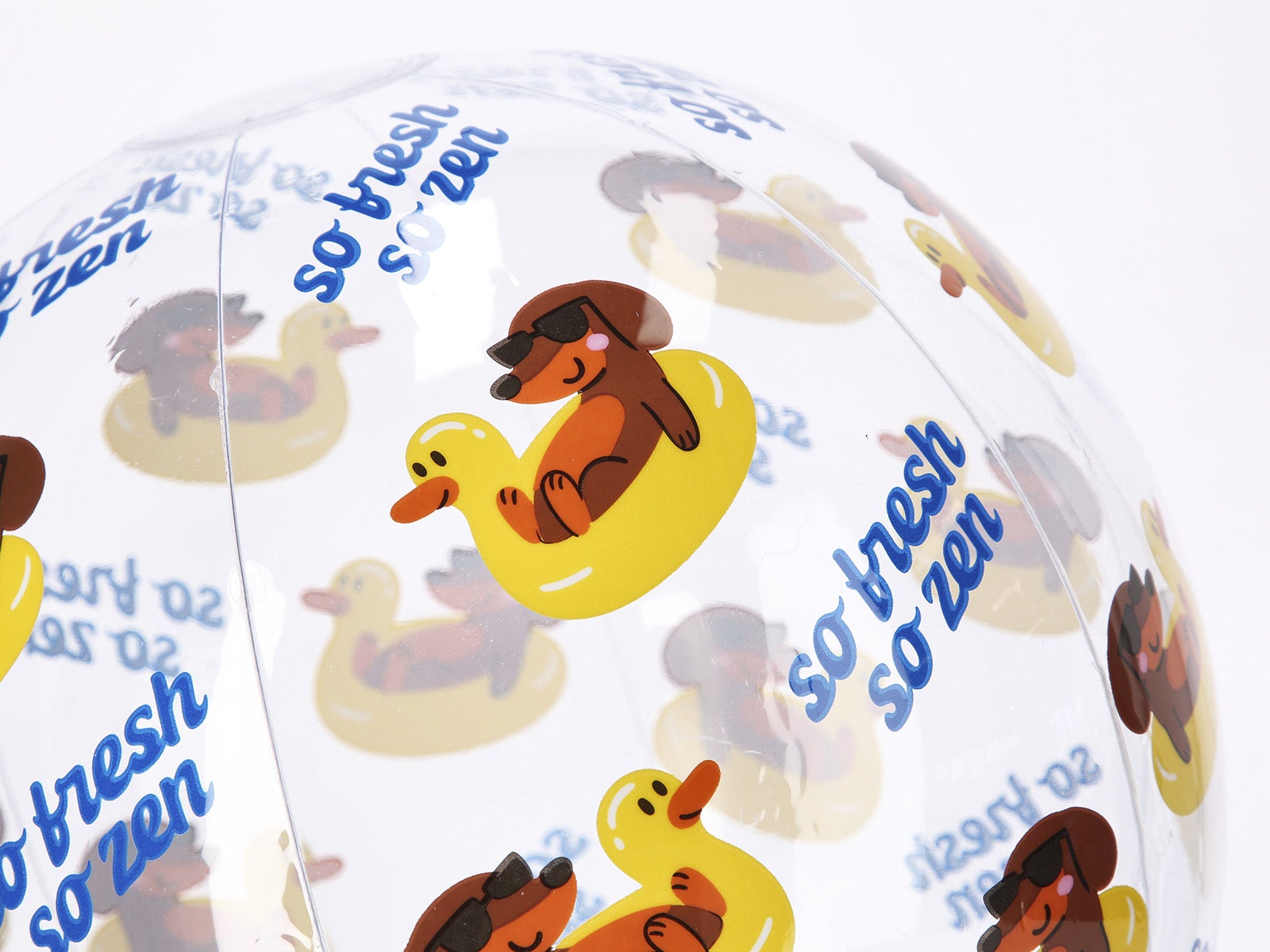 Diseño exclusivo: Cuerpo transparente decorado con simpáticos perros salchicha en flotadores de patito y el lema "So fresh so zen".