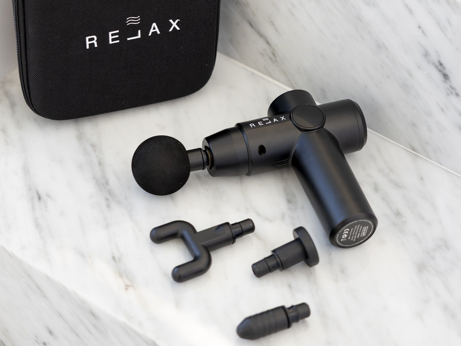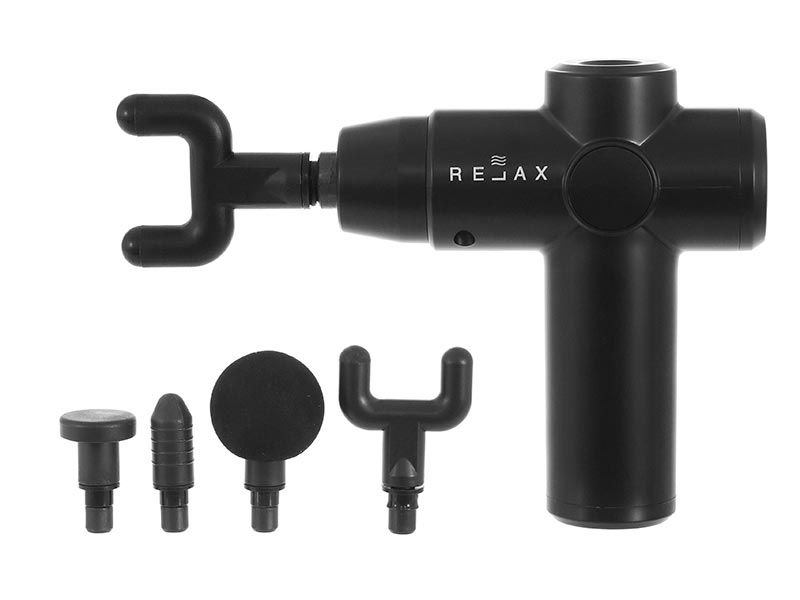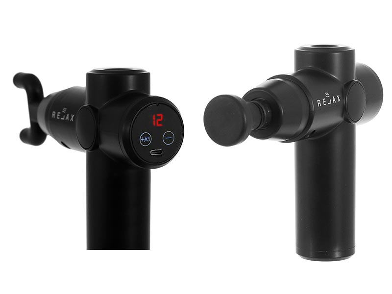 Diseño: pistola de masaje de color negro con el diseño alehopero ‘relax’. En la parte trasera tiene una pantalla digital.