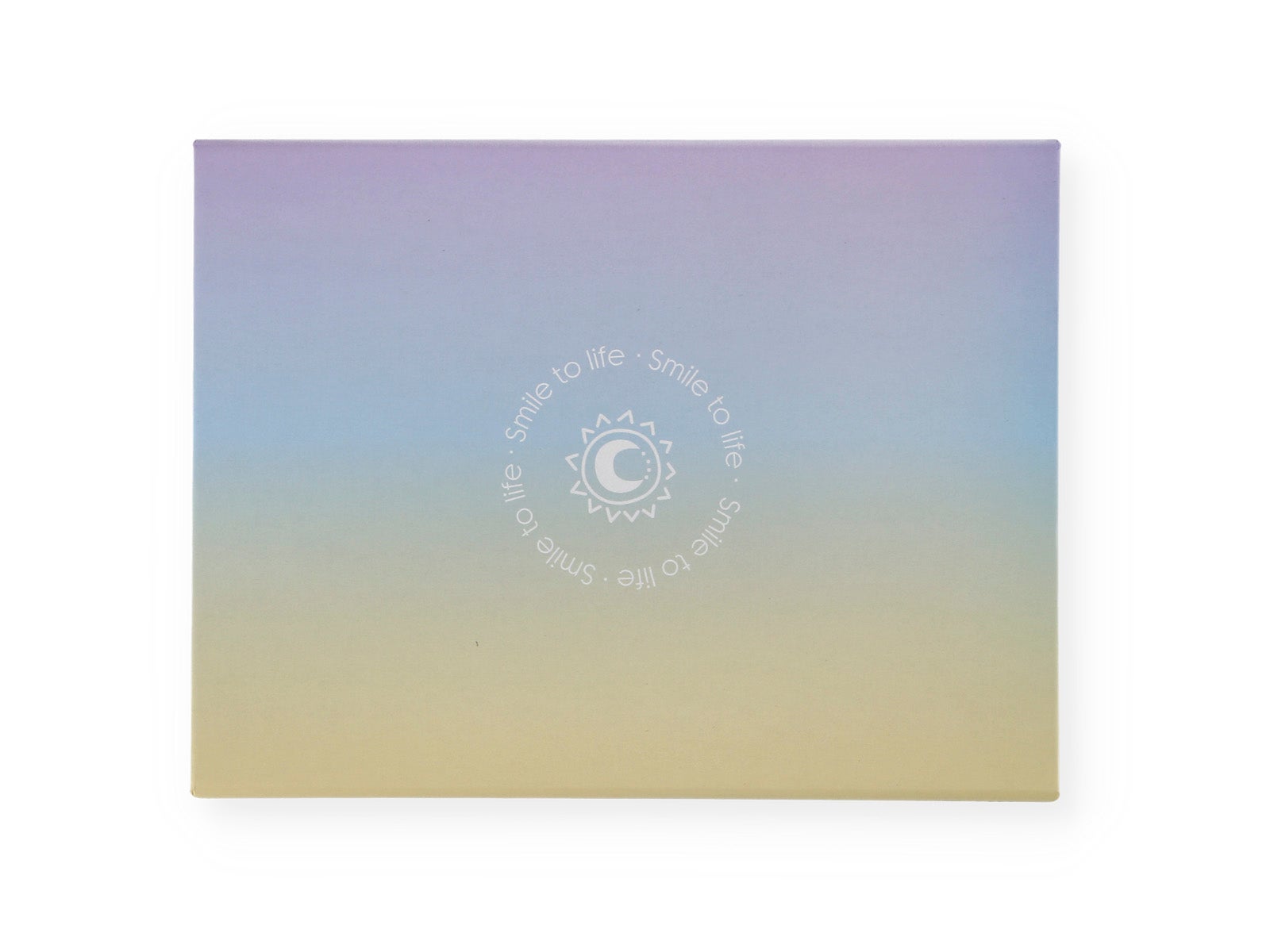 Exterior: estampado degradado en tonos rosa y amarillo y texto en portada ‘be proud of yourself’.