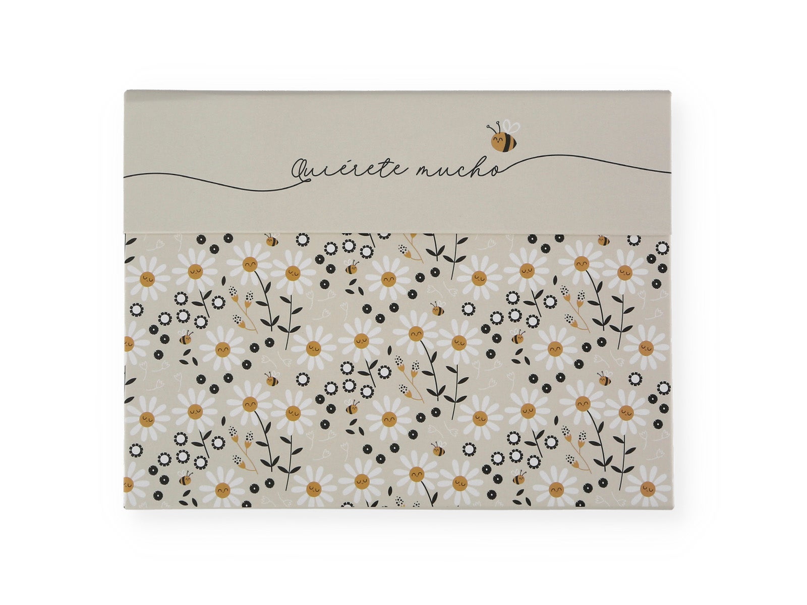 Exterior: beige con dibujos varios de flores, plantas y margaritas, texto en la portada ‘quiérete mucho’.