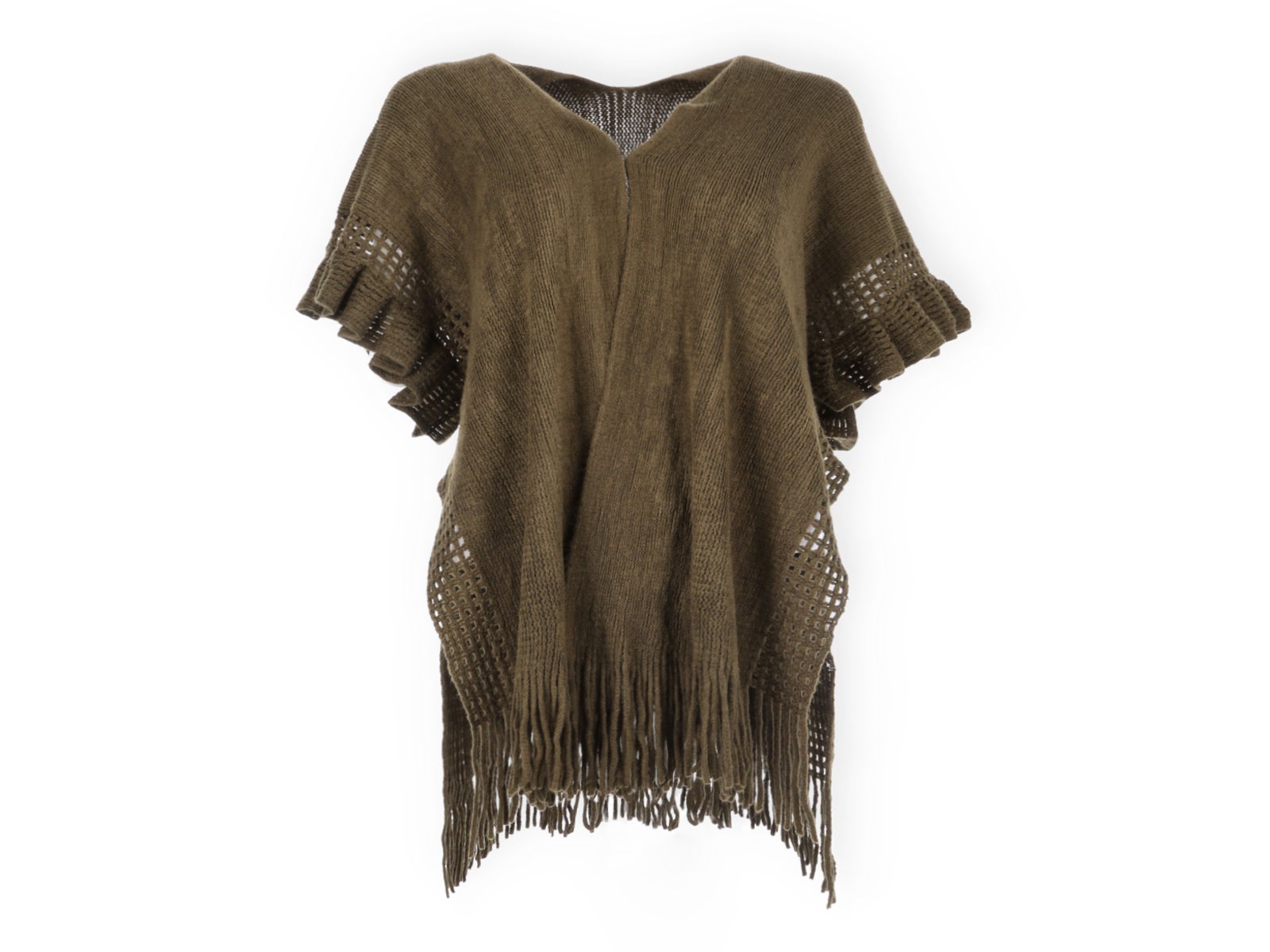 - Diseño: Poncho de tela color verde con volantes en ambas mangas. Presenta un atractivo dibujo de agujeros desde la manga hasta el final del poncho y, para un extra de diversión, ¡flecos en el borde!