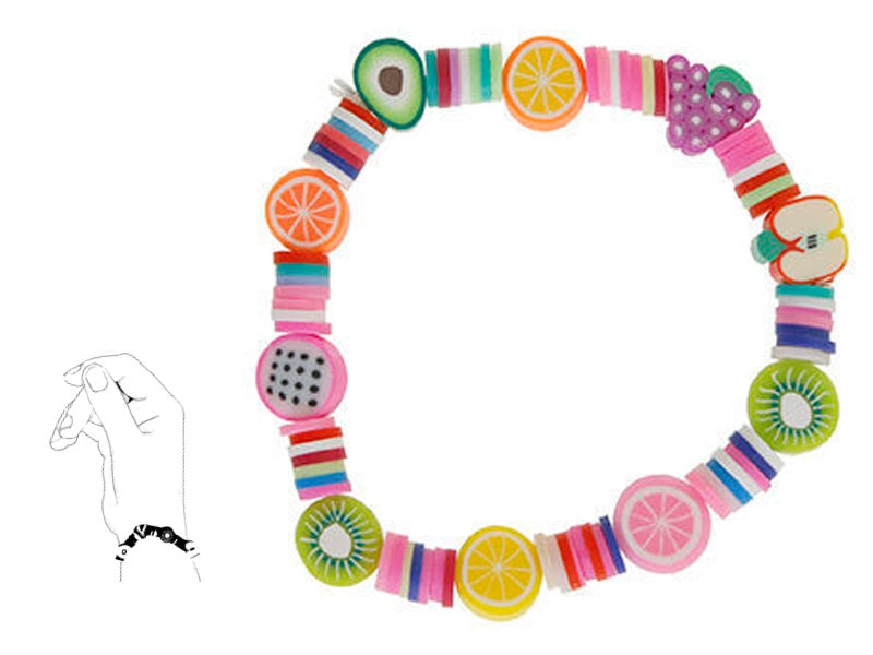 Diseño: pulsera de cuentas multicolor con formas de fruta.