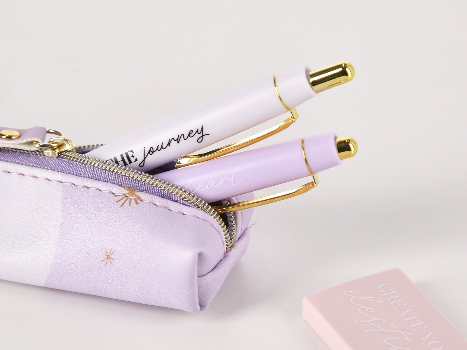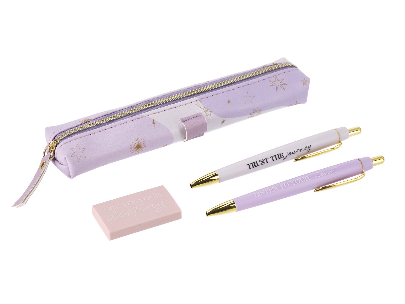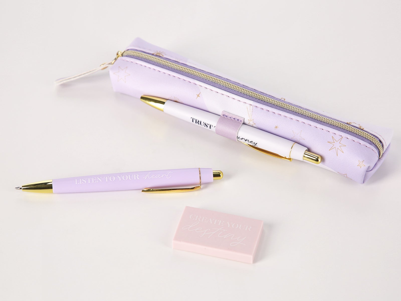 - Complementos divertidos: Incluye dos bolígrafos ideales para tomar apuntes con estilo y una goma que borra errores con gracia.