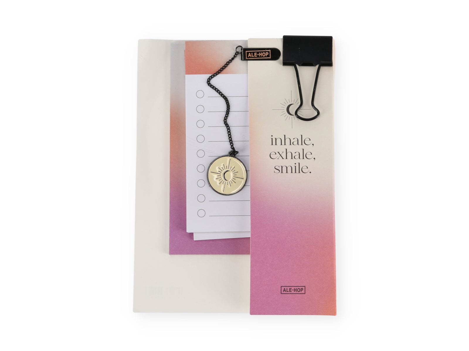 Set de notas 'Inhale, exhale, smile' para organizar tus pensamientos con alegría. Ideal para llevar a cualquier lugar, ofrece calma y felicidad. Relájate y sonríe con ALE-HOP.