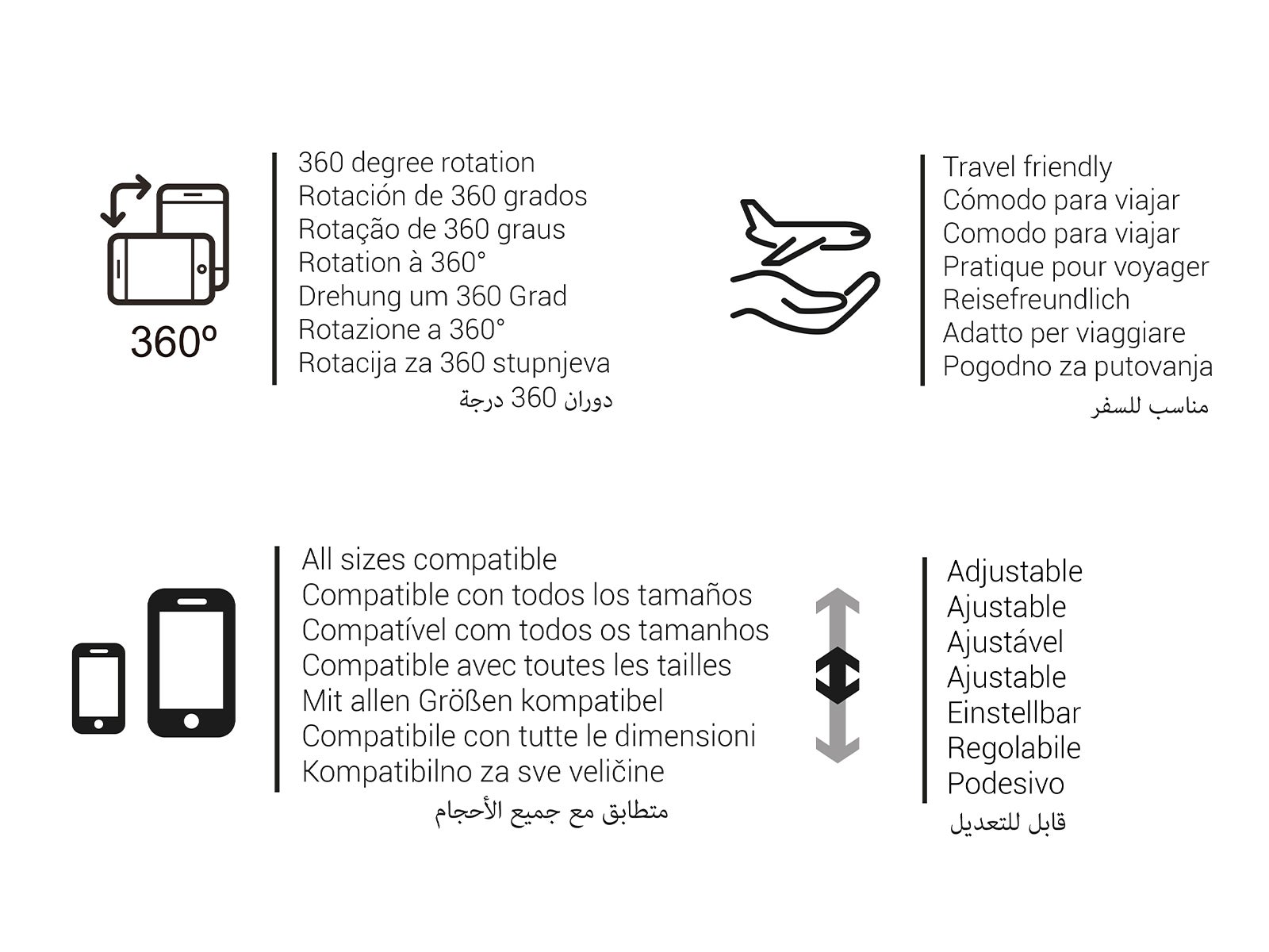 Diseño: trípode con patas flexibles, con soporte ajustable a cualquier móvil.