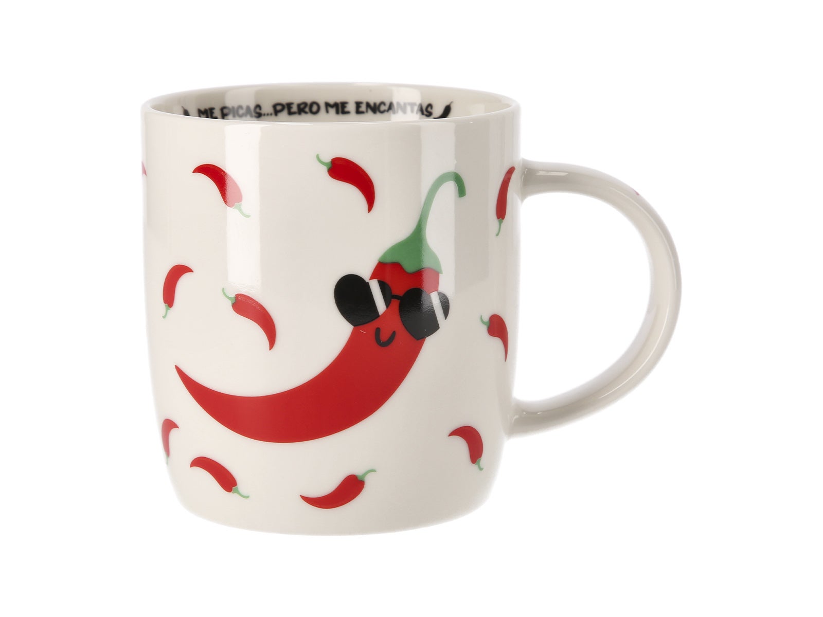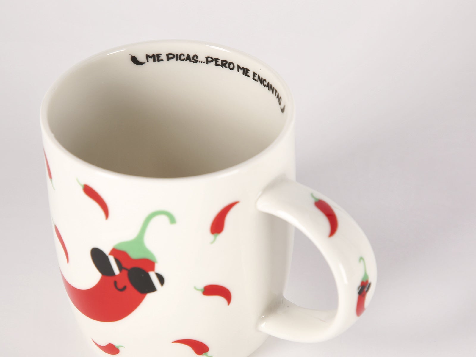 - Diseño con carácter: taza con asa y estampado de chiles rojos y mensaje divertido que roba sonrisas al primer vistazo.