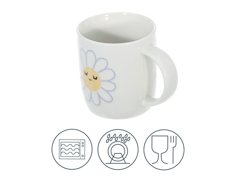 <li> <strong>Diseño</strong>: Una taza de color blanco que muestra una flor sonriente y amarilla en un lado y la expresión alegre "SOUNDS GOOD" en el otro lado. ¡Es la perfecta combinación entre diversión y estilo!</li>