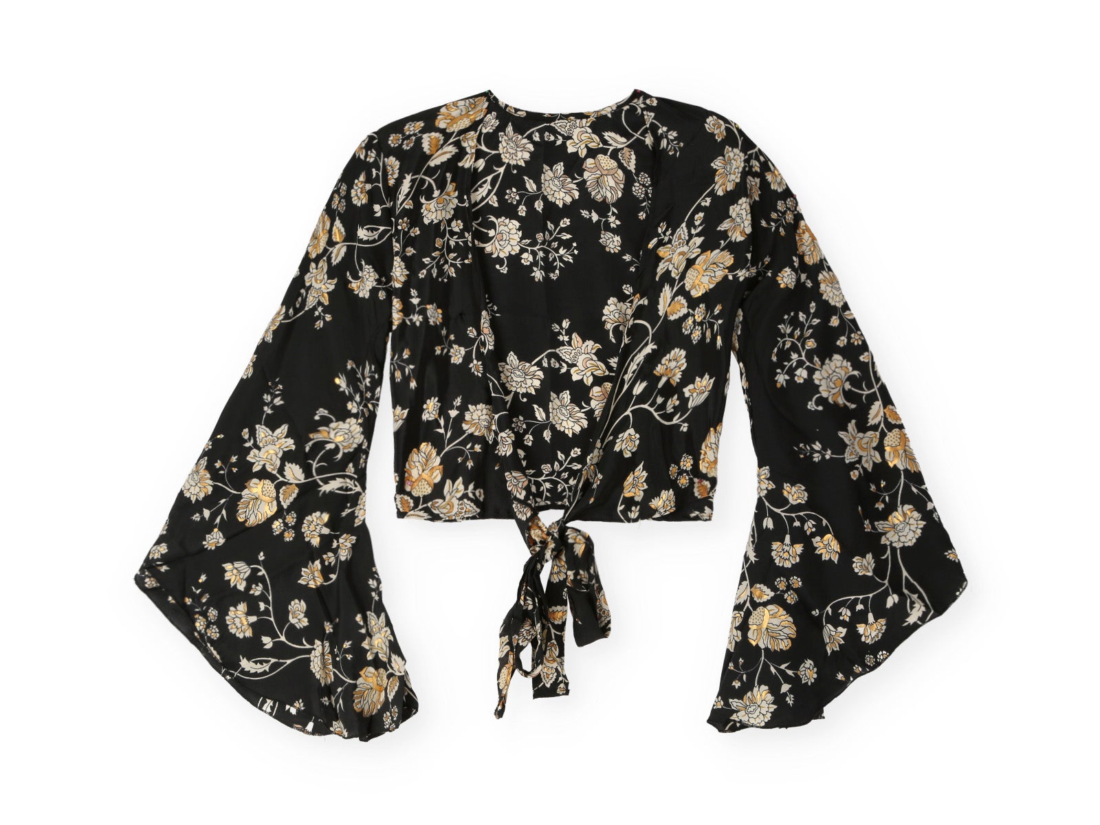 - Diseño desenfadado con un patrón de flores y detalles dorados que capturan la luz y las miradas.