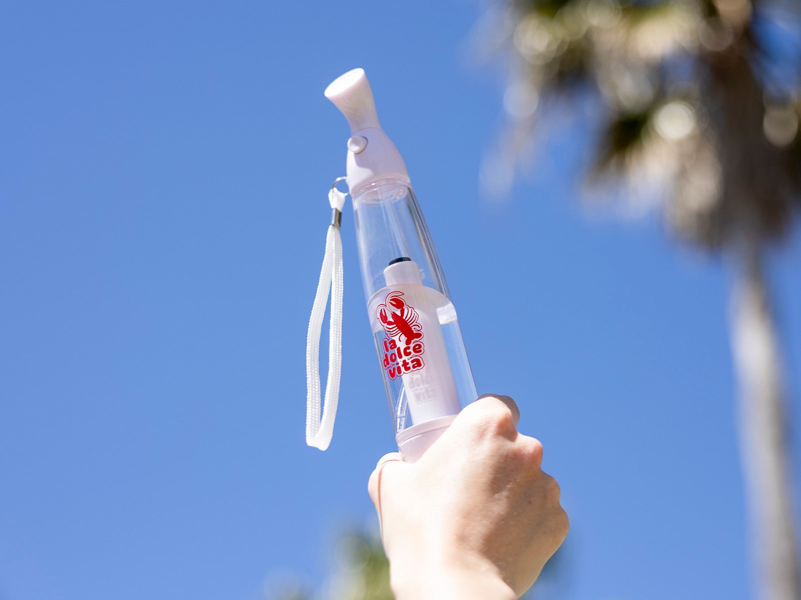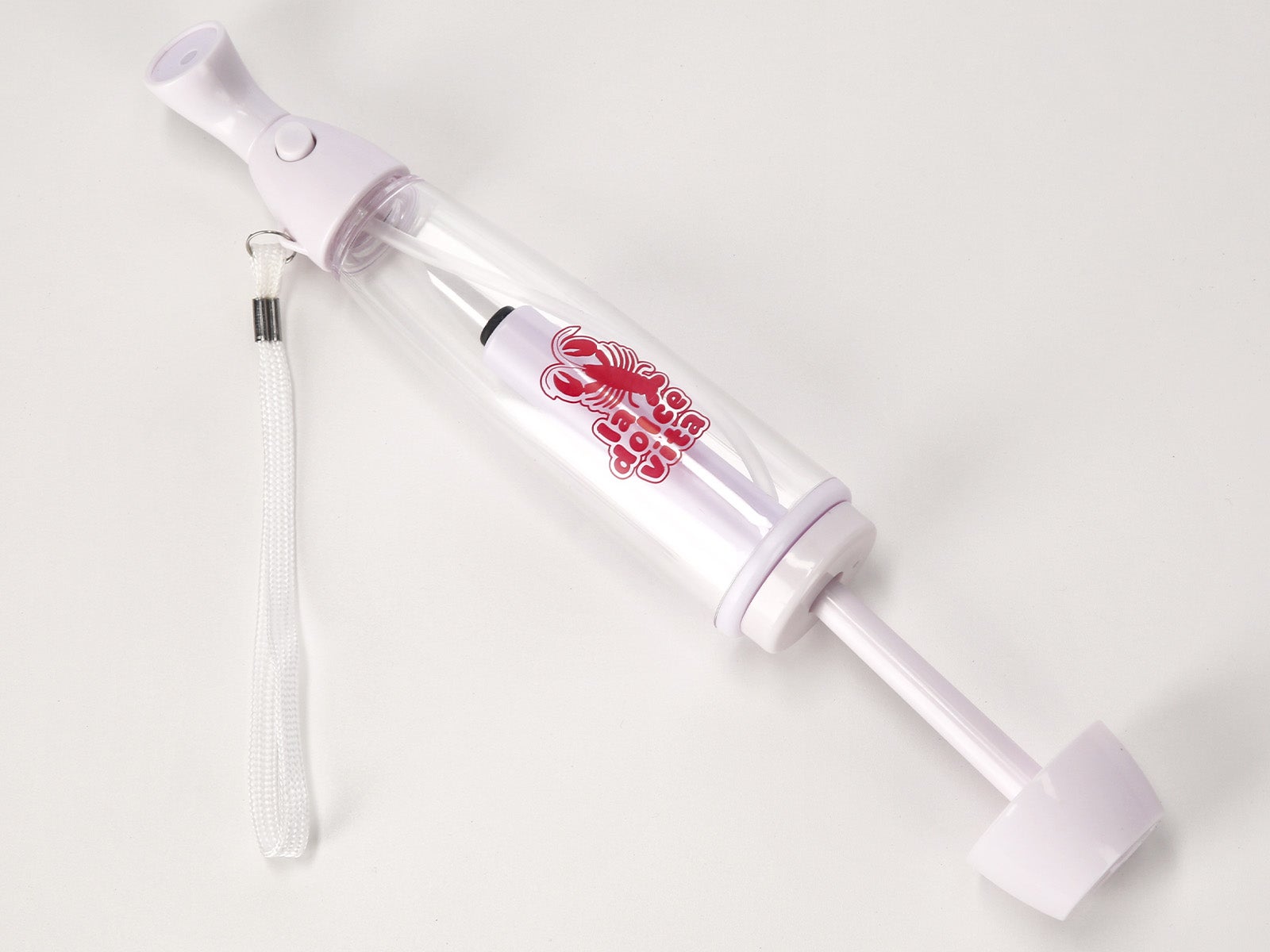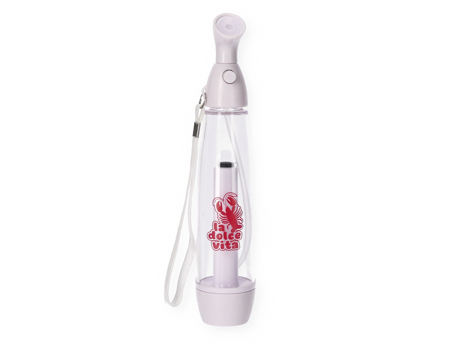 Diseño La dolce vita: Cuerpo transparente con el lema "La dolce vita", un divertido dibujo de una langosta y detalles en color blanco.
