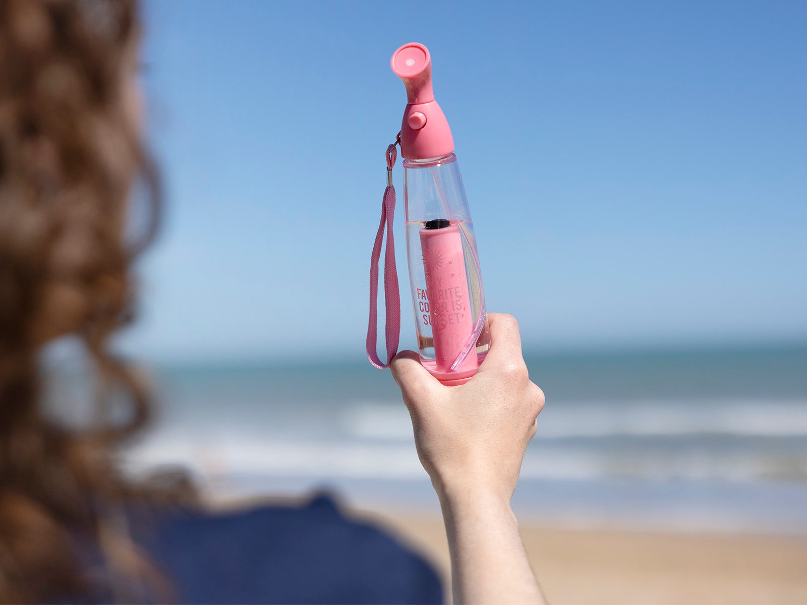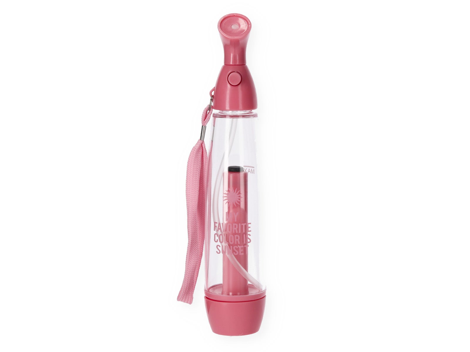 Diseño inspirador: Cuerpo transparente con la frase "My favourite color is sunset" y detalles en rosa vibrante.