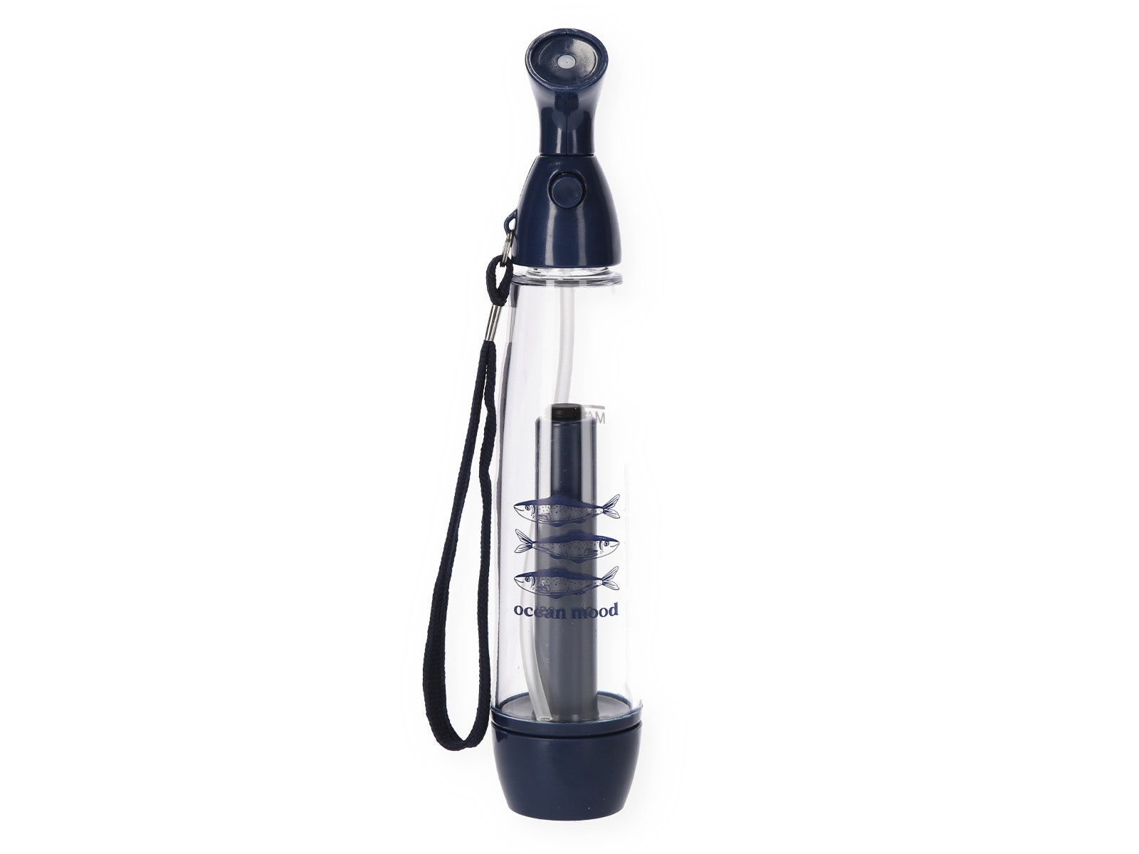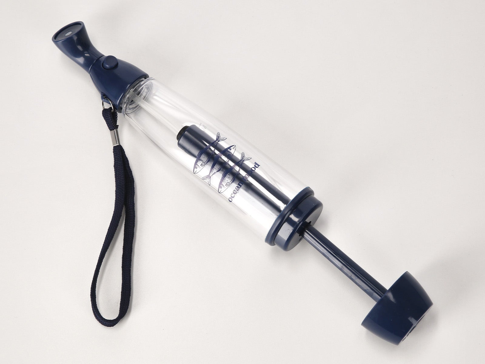 Diseño Ocean mood: Cuerpo transparente con un elegante estampado de sardinas y detalles en azul marino.