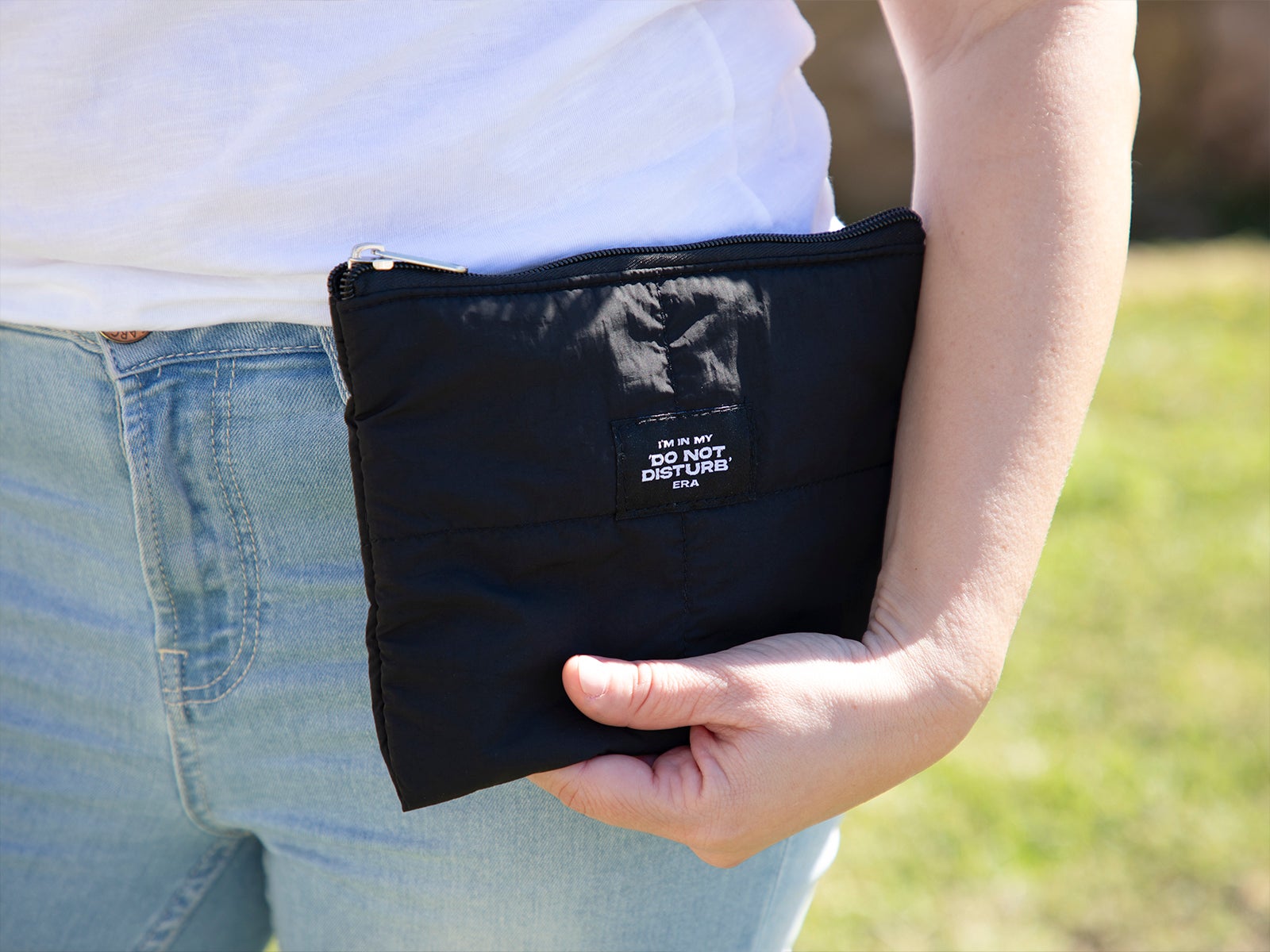 Custodisci i tuoi oggetti essenziali nel Beauty case a quadri. Con il suo design imbottito tipo "puffy" in un elegante colore nero, questo beauty è tanto leggero quanto pratico. Il dettaglio della toppa con il messaggio "I'm in my 'Do not disturb' era" aggiunge quel tocco divertente e ribelle che amiamo tanto, mettendo in chiaro che i tuoi momenti di cura personale sono sacri. È della dimensione ideale da tenere in borsa, in valigia o sempre a portata di mano sulla tua postazione trucco.
