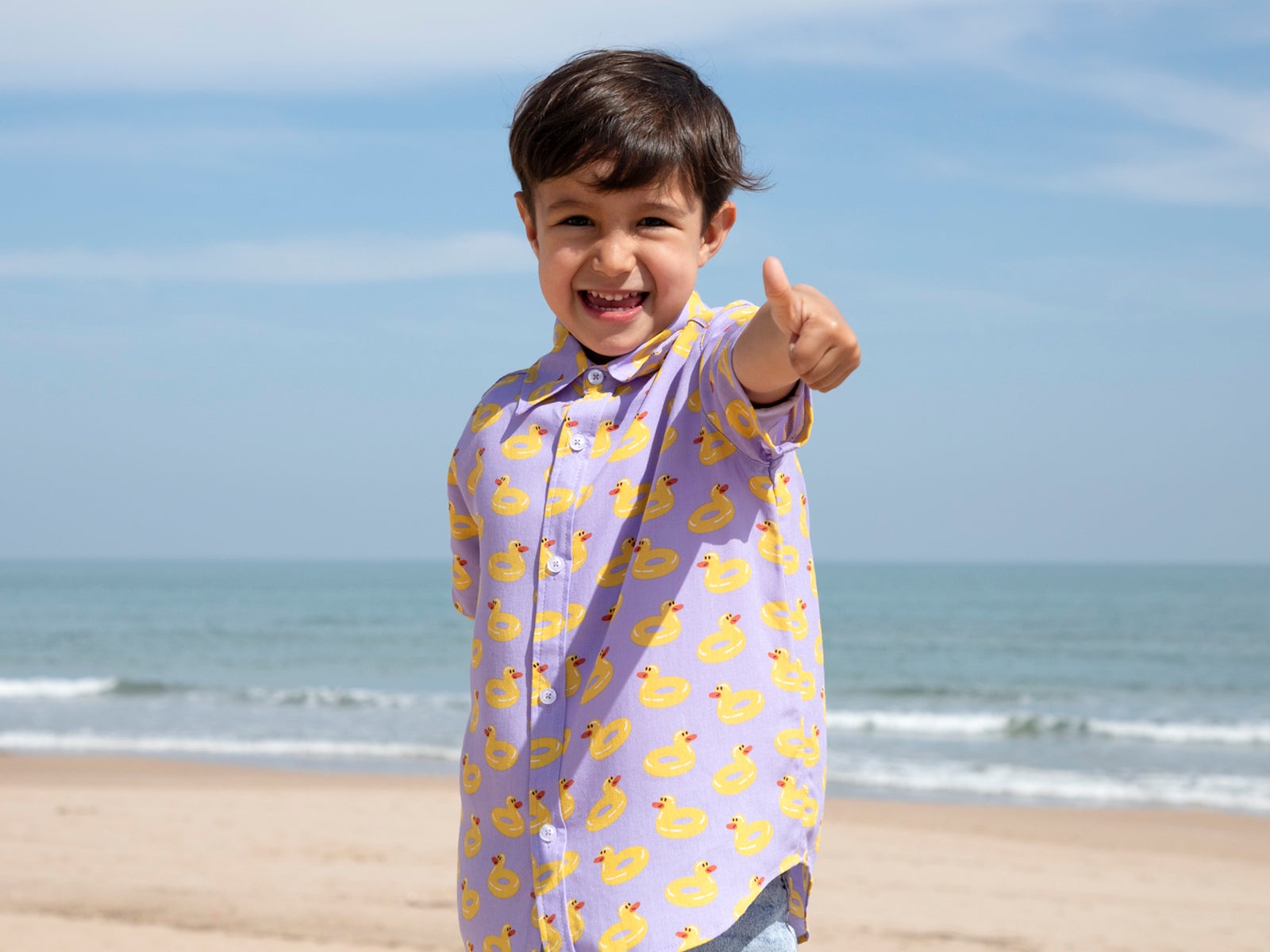 Rendi la sua estate indimenticabile con la Camicia per bambini con papere. Questo capo si distingue per l'originale colore lilla e una stampa di paperelle gialle che dona un'aria fresca, divertente e molto moderna. Con il tocco creativo di ALE-HOP, è la camicia ideale per godersi le vacanze, le passeggiate sulla costa o qualsiasi festa sotto il sole.
