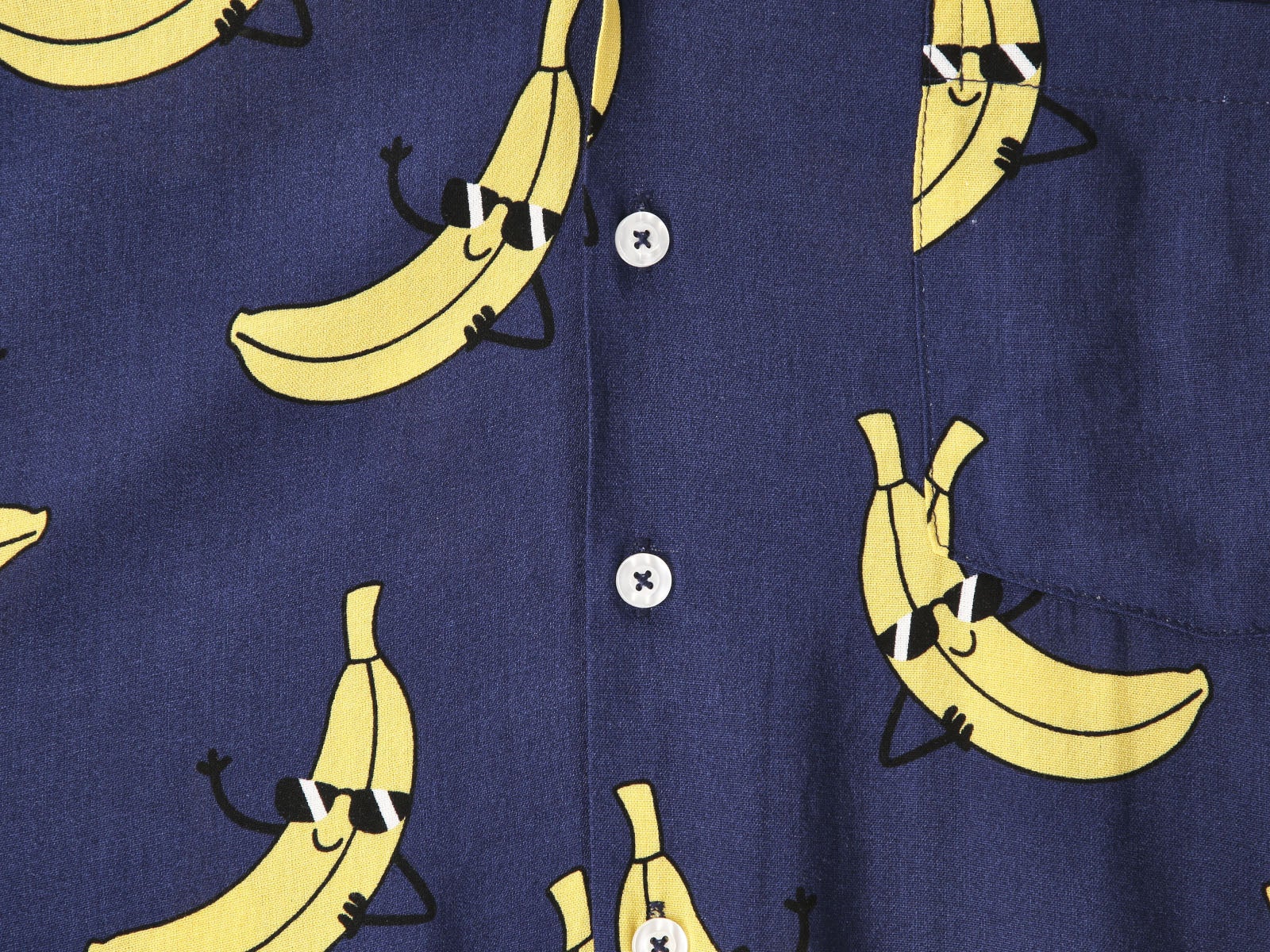 Aggiungi un tocco di freschezza e originalità ai tuoi look con la Camicia unisex con banane. Questo capo si distingue per la vivace stampa di banane con occhiali da sole su sfondo blu navy, creando un contrasto moderno e pieno di personalità. Con il tocco creativo di ALE-HOP, è l'opzione ideale per festival, vacanze o qualsiasi giorno in cui vuoi che i tuoi vestiti parlino per te.