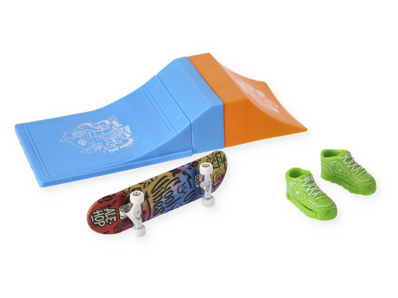 Pura adrenalina per le tue dita! Il set Skatepark con skateboard di ALE-HOP include rampa, tavola con design incredibili e mini scarpe. Perfetto per migliorare la tua abilità e fare trick ovunque.