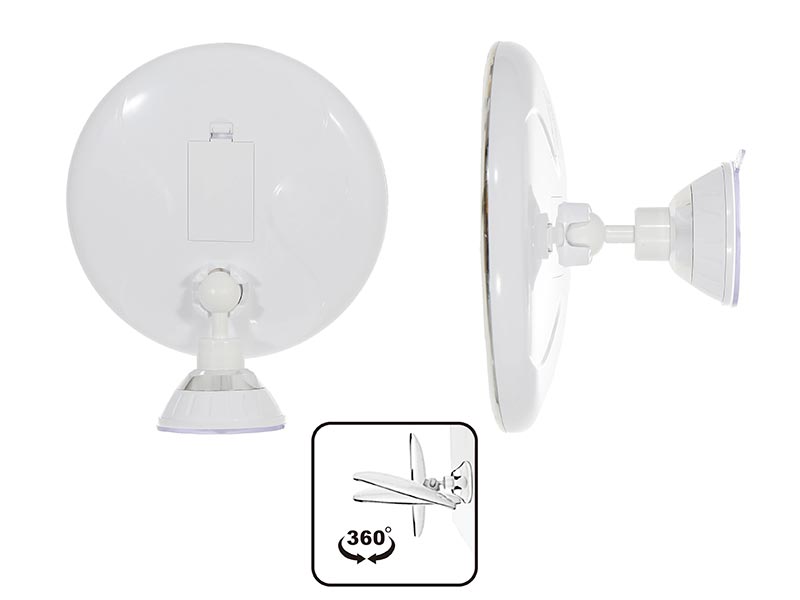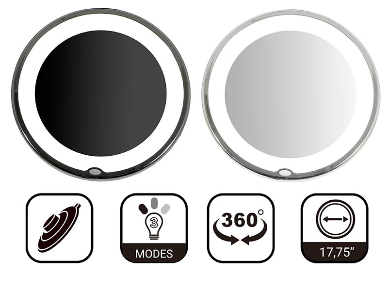 Design: specchio circolare con luce incorporata, ingrandimento 10x e con ventosa in silicone per poterlo appoggiare su parete o specchio e spostarlo nell'angolazione desiderata.