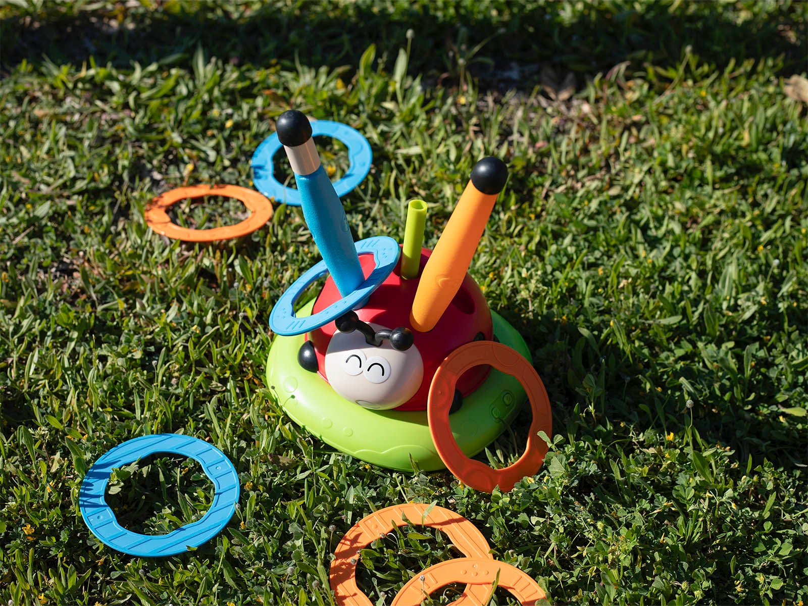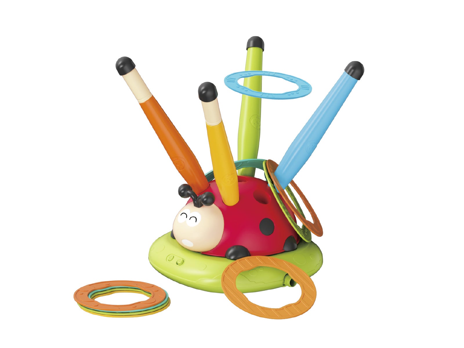 Jogo de pontaria: Inclui argolas coloridas para lançar e encaixar nos postes da joaninha.
