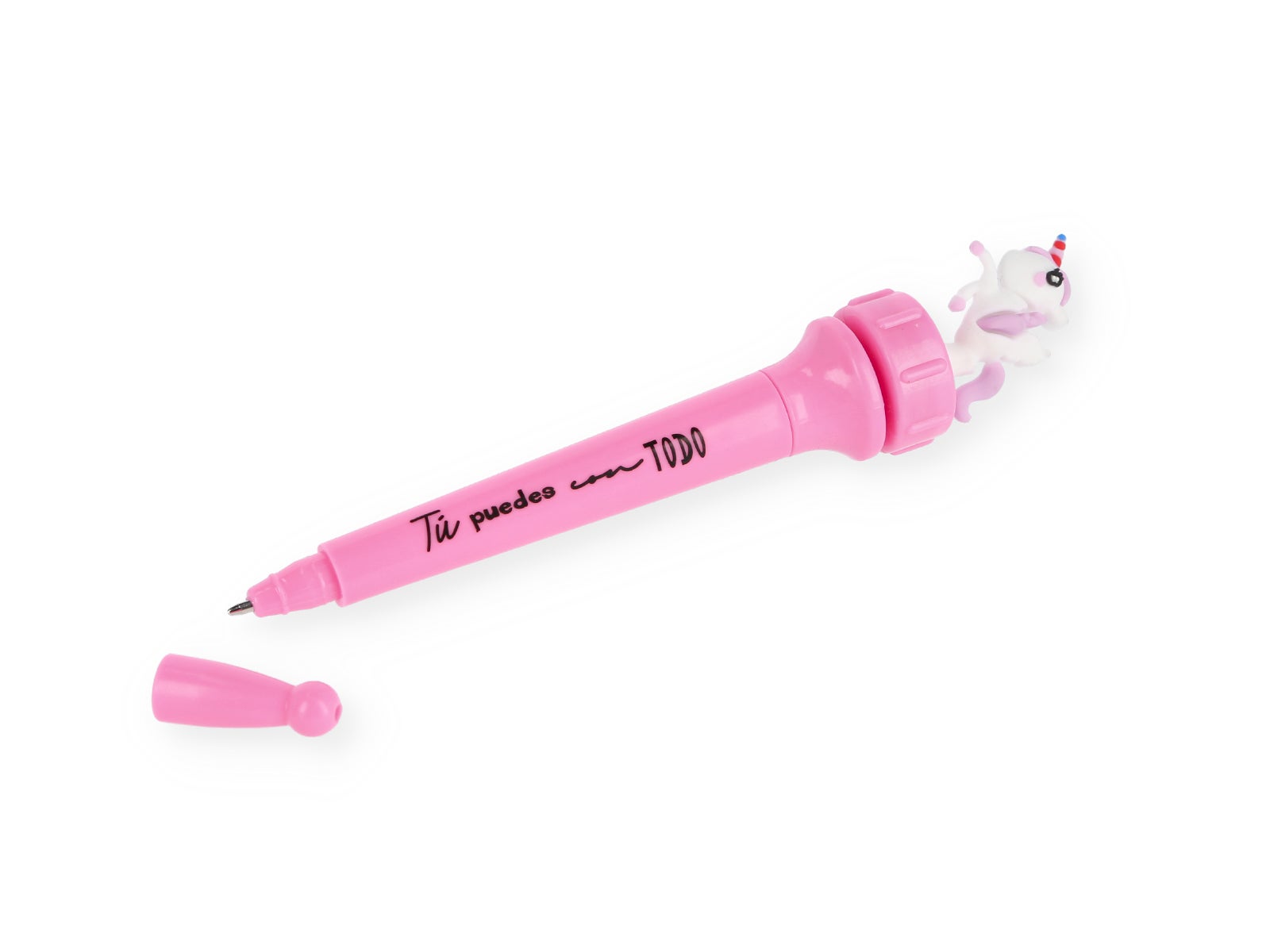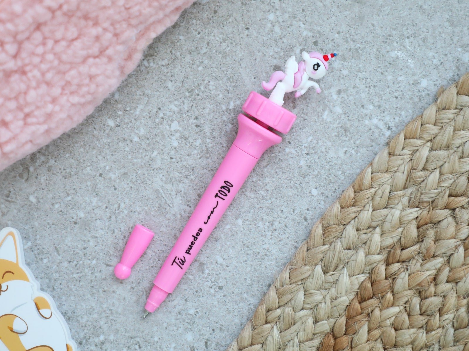 Design: caneta de cor rosa com a frase 'podes fazer tudo'. Na parte superior tem um unicórnio que roda sem parar. Na ponta tem uma tampa que a protege com a extremidade redonda semelhante a uma bolinha.