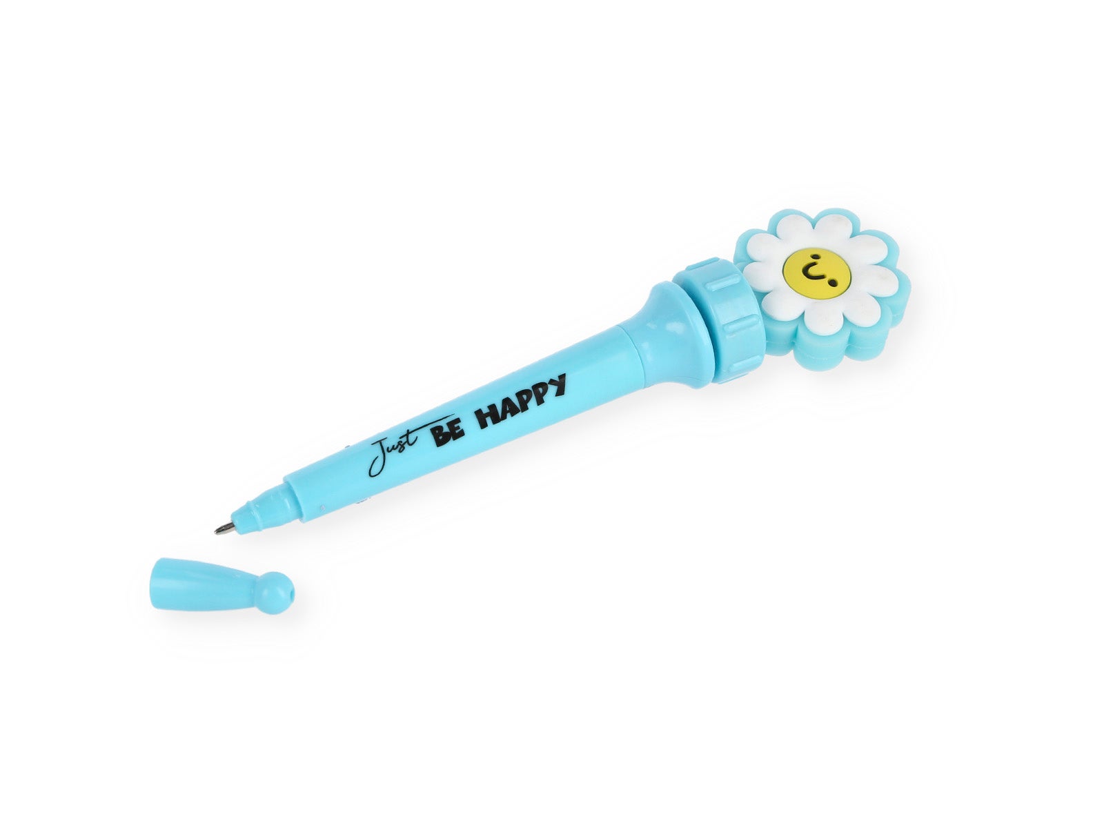 Design: esferográfica de cor azul claro com a frase ‘just be happy’. Na parte superior tem um coração que roda sem parar. Na ponta tem uma tampa que a protege, com a extremidade redonda como uma bolinha.