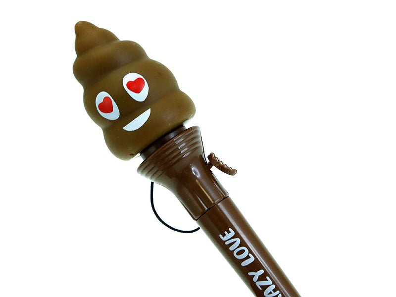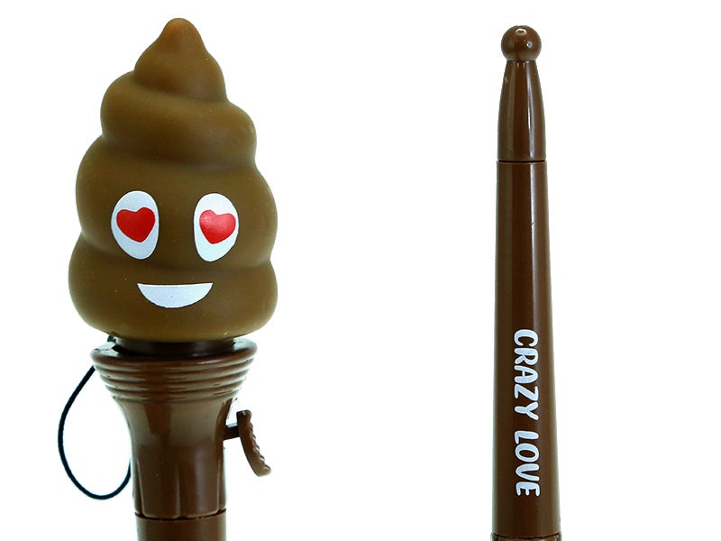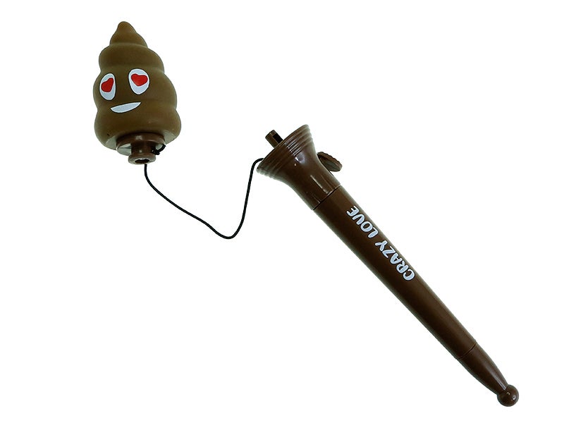 Design: bolígrafo castanho com frase 'crazy love' com "brinquedo voador" numa das extremidades, e na outra uma tampa que protege a ponta da caneta. O brinquedo tem forma de caca com cara e corações nos olhos, e justo debaixo há uma alavanca ou clique que, ao pressionar, o brinquedo será disparado mas o elástico impedirá que se solte e se perca.