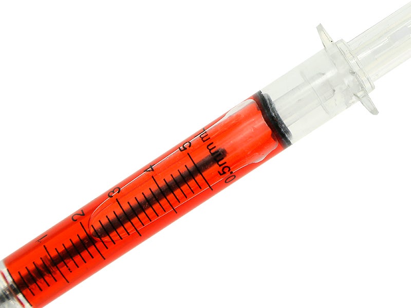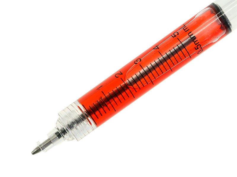 Design: caneta em forma de seringa, com linhas e números impressos e líquido vermelho em seu interior que dá a impressão de ser uma seringa real.